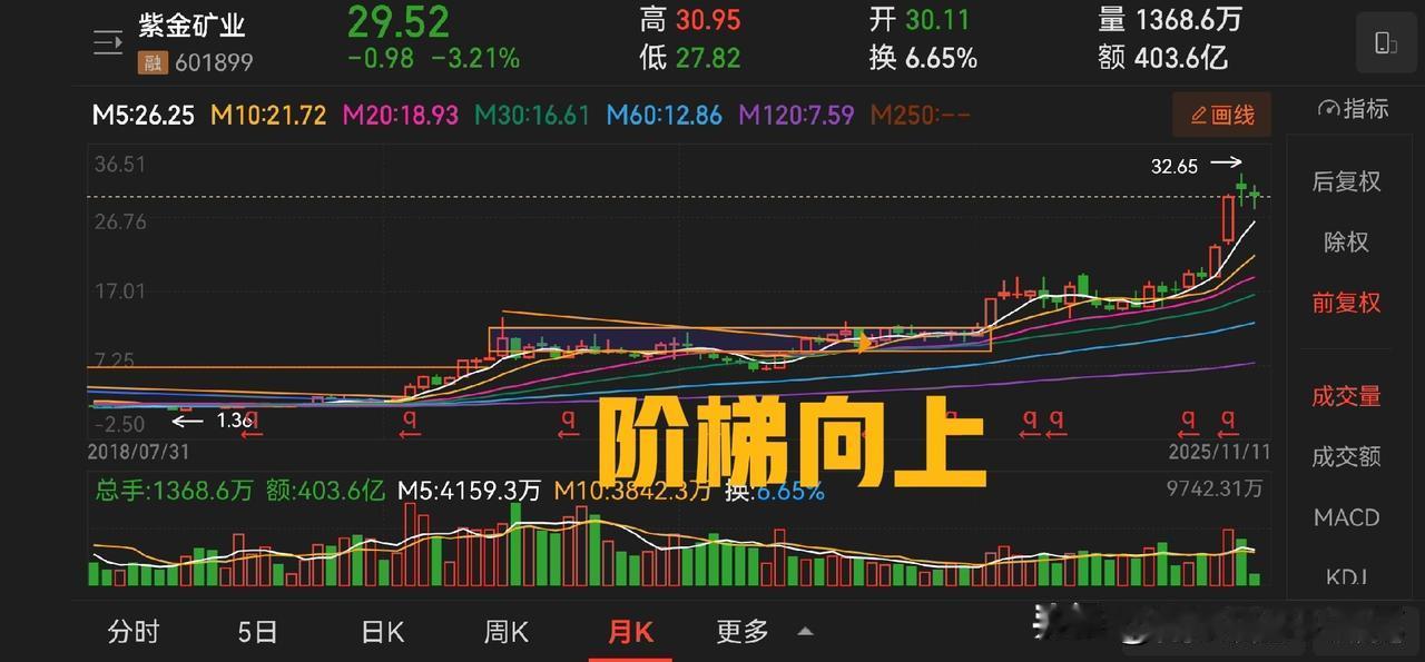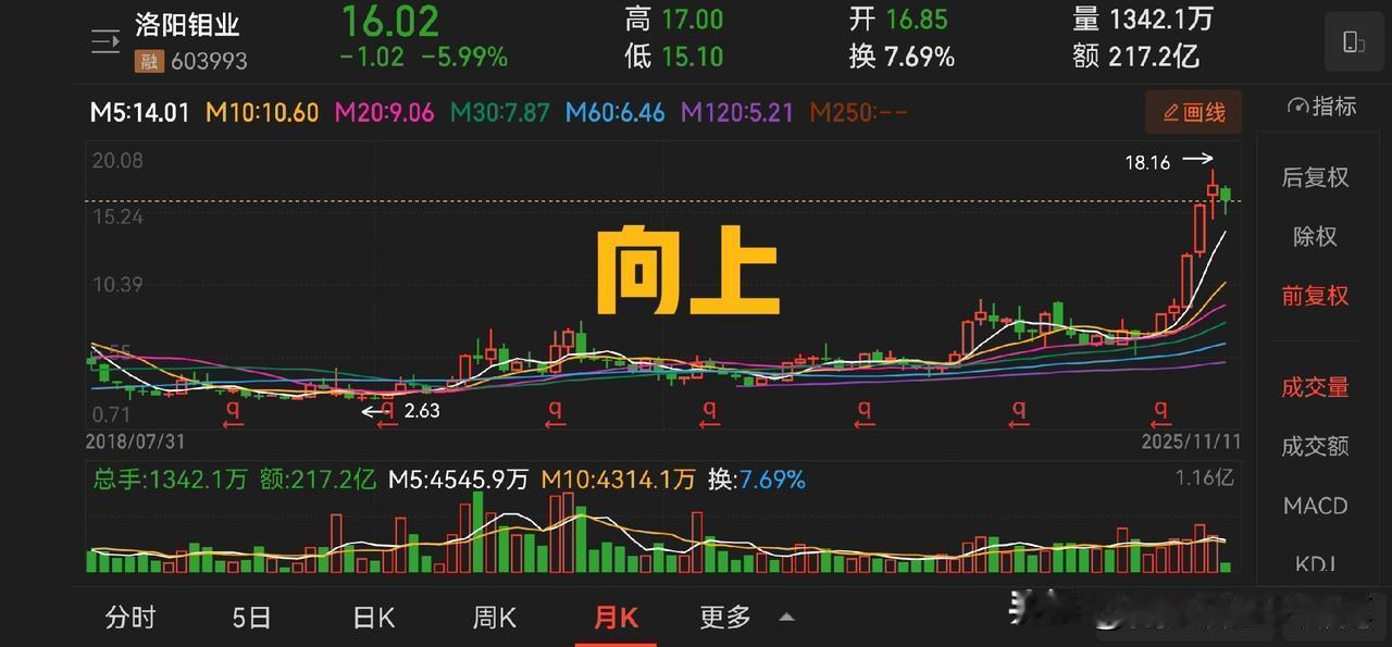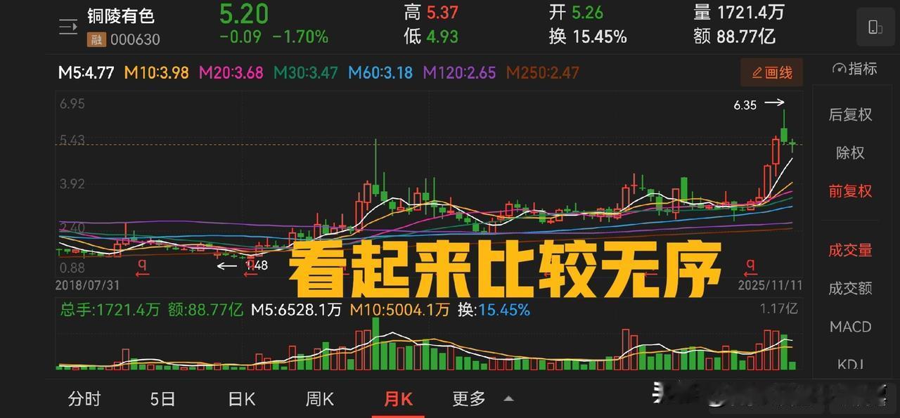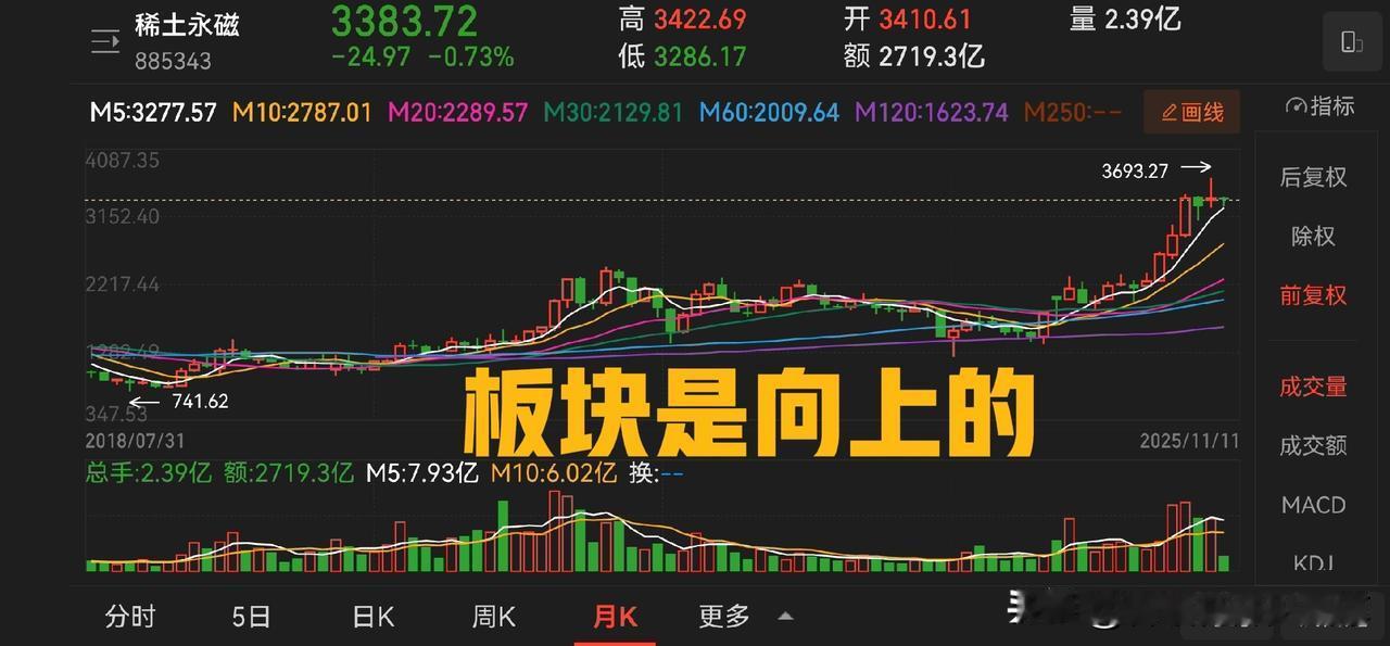 结合北方稀土,我们来看几种长期波动的类型。北方稀土属于典型的宽幅波动、周期性比较强的品种,反观洛阳钼业、紫金矿业,中年虽然也有震荡,但是属于典型的长期向上的品种。 铜陵有色,长期走势看起来就比较弱,和北方稀土比起来,铜陵有色的长期关注价值更低。 在这个时候,我们可以看到稀土永磁板块的走势是一直向上的,这其中是因为很多有色龙头企业也被归并到了稀土永磁板块里。 所以我们看北方稀土的时候,一时之间很难出清,是因为短期的赚钱效应确实比较明显,在市场中也有相应的号召力,特别是结合了中美之间的贸易战,给大家带来了太大的想象空间。 这一轮山东黄金涨的其实不是改好,不如紫金矿业和洛阳钼业,甚至也不如北地方稀土。 像这些股票走势的特征,原来一般被人称之为股性。