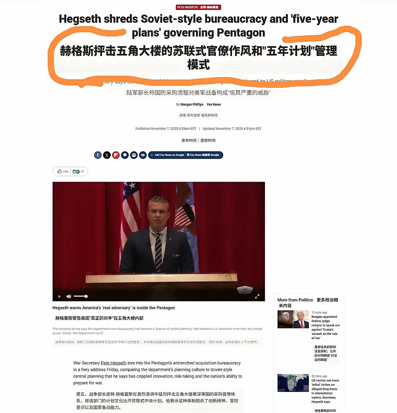 我差点以为美国战争部长赫格塞思少尉又在老调重弹宣扬中国威胁论,结果发现,居然不是。 说什么计划经济,说什么五年计划,说什么构成对美国最严重威胁的对手————你猜,部长少尉说的是谁? 我也没有想到,他说的居然是美国五角大楼。就是他管辖的那片地儿。 最让我震惊的不是他的内容,而是他的这种行为,他们居然开始反思自己了!居然开始反思自己了! 学会孔夫子说的吾日三省吾身了。 [捂脸]这是真的想要让美国再次伟大啊。不要小看少尉,法国皇帝也是从一个炮兵少尉干起来的。 看来这个少尉志在美国皇帝啊。 点右上角关注我,我们一起去看这个魔幻的世界