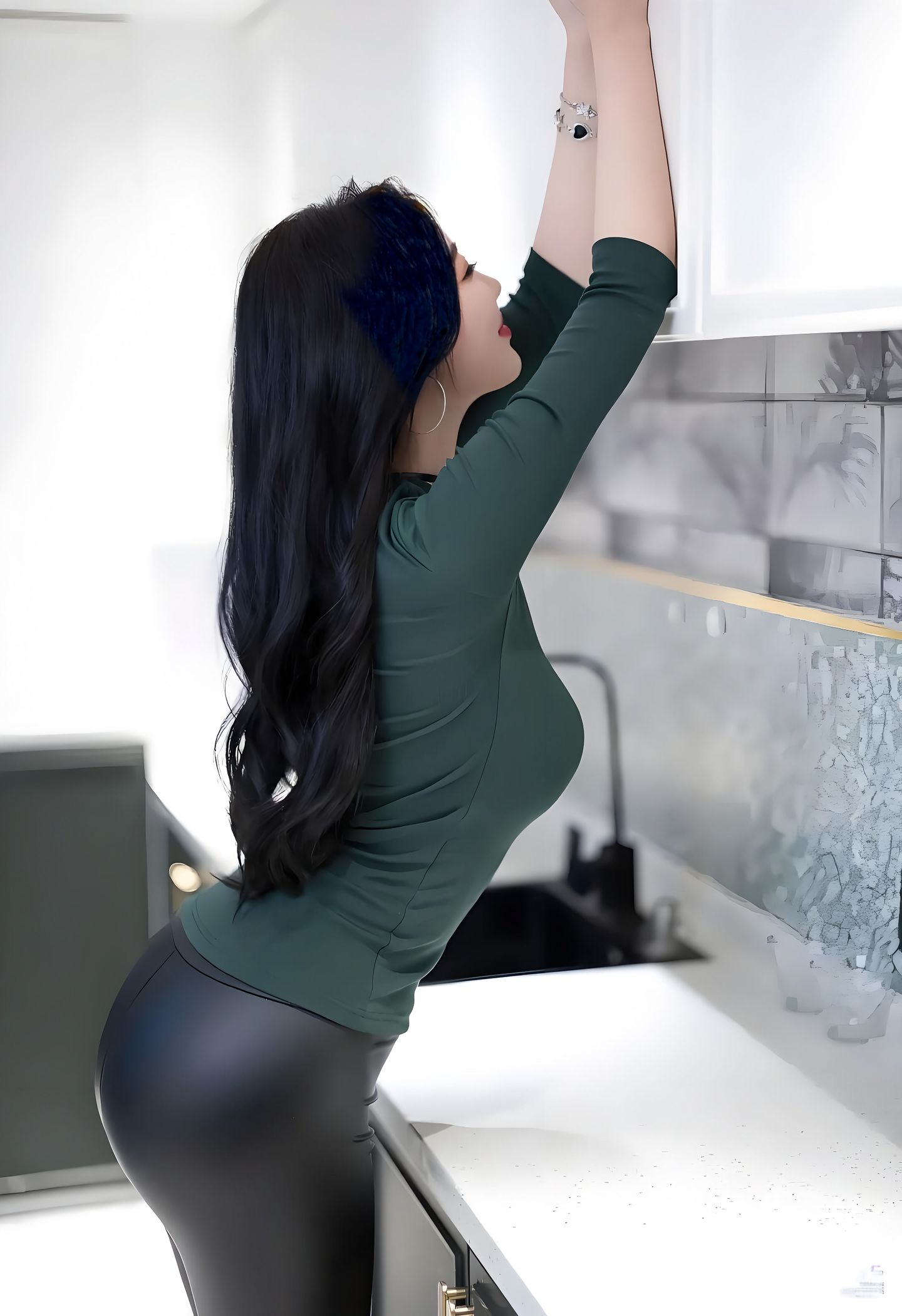 优雅厨房自拍,时尚连衣裙与高跟鞋的完美搭配