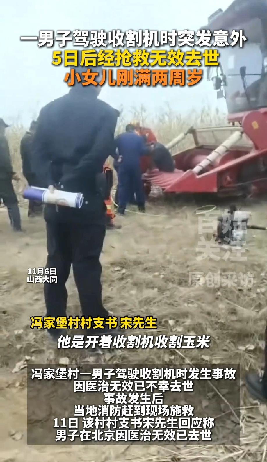 悲剧还是发生了!山西大同,一36岁男子正驾驶着收割机在地里忙活,却不料,收割机出现故障,男子被割伤,5日后经抢救无效去世。知情人:“儿子刚上高中,小女儿刚满两周岁”。 (来源:百姓关注) 11月初的山西大同冯家堡村,田间还残留着秋收的痕迹,36岁的村民正驾驶着收割机在地里忙活。 谁也没想到,这台平日里帮衬着农户收割希望的“铁家伙”,会突然酿成惨剧。 那天田间的风不算大,机器的轰鸣声在空旷的田野里格外清晰,周围还有几位村民在收拾农活,突然一声惊呼打破了平静。 男子操作的收割机发生意外,他被机器伤到,当场倒在了田埂上。 旁边的村民赶紧冲过去,有人立刻拨打了120急救电话,还有人尝试联系他的家人。 看着倒在地上的同乡,大家急得团团转,只能一边简单处理伤口,一边盼着救护车快点来。 很快,急救人员赶到现场,将受伤严重的男子抬上担架,一路疾驰送往医院。 为了争取最好的治疗效果,家人又辗转将他送到了北京的医院,可即便经过了5天日夜不停的抢救,医生最终还是摇了摇头,这个年轻的生命在11月10日晚上10点多永远停在了36岁。 村里人提起他都忍不住叹气,说他是家里的顶梁柱,上有老人要赡养,下有两个孩子要照顾,大儿子刚上高中,小女儿才刚满两周岁,还在牙牙学语,正是离不开爸爸的时候。 出事前,他还盘算着收完这季庄稼,就带着小女儿去城里买新衣服,可这个简单的承诺,终究没能实现。 如今,那个总是围着他喊“爸爸”的小丫头,还不懂什么是离别,只是偶尔会到处张望,像是在寻找那个熟悉的身影。 事件传到网上后,网友们纷纷表达了痛心和惋惜。 有网友说,农忙时节的意外太让人揪心了,36岁正是扛家的时候,留下老婆孩子和老人,往后的日子可怎么过。 还有网友分享了类似的经历:“我们村之前也发生过农机事故,收割机看着好用,可操作时一点疏忽都不能有。” 也有网友呼吁相关部门该多普及农机安全知识,让干活的农户都能多些保障。 在我看来,这起悲剧不只是一个家庭的不幸,更敲响了农机作业安全的警钟。 农机手们靠着这些“铁家伙”讨生活,可很多人可能没意识到,收割机的操作风险远比想象中高,不管是触碰电线、侧翻,还是像这次的挤压碰撞,每一种意外都可能致命。 很多农机手作业时凭着经验来,忽略了安全检查,也没留意周边环境,可就是这一点点侥幸心理,就可能酿成无法挽回的后果。 更让人揪心的是,这些农机手大多是家庭的顶梁柱,他们的离去,往往意味着一个家庭的崩塌。 就像这家人,两个孩子还需要抚养,老人需要赡养,后续的生活重担都压在了妻子一个人身上。 其实类似的农机事故每年都有发生,有的是因为操作不当,有的是因为机械老化,还有的是因为作业环境复杂,这些本可以通过提前预防来避免的悲剧,却一次次重复上演。 希望这起悲剧能让更多人重视农机作业安全,让相关的保障措施能真正落实到位,不再让“顶梁柱”们带着遗憾离去,不再让年幼的孩子失去父亲,不再让这样的悲剧重复发生。 愿每一位劳动者都能平安归家,愿每一个家庭都能团圆美满,这才是丰收最美的意义。