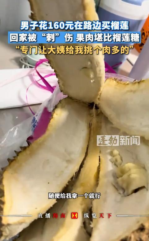 “赔惨了!”11月5日,黑龙江大庆,一男子晚上回家时,见路边有大姨在卖榴莲,只要十多块钱一斤,他觉得非常便宜,就花160元买了一个,还特地让大姨给挑个肉多的,回家后打开一看,傻眼了!网友:没准真是肉最多的。 下班路上的张先生裹了裹外套,正想着早点回家歇着,路边一个临时支起的榴莲摊突然抓住了他的目光。 摊前的大姨手脚麻利地摆弄着榴莲,见张先生驻足,立刻热情地招呼,小伙子,我这榴莲都是刚到的好货,甜得很!你放心,我给你挑个肉厚核小的,保准划算。 张先生本就爱吃榴莲,这低价再加上大姨的打包票,心里的防线瞬间被攻破。 刚进门,张先生就迫不及待地找出水果刀,准备享用这份期待已久的美味。 他顺着榴莲的裂缝轻轻划开,厚重的果壳裂开时发出“咔嚓”的声响,可当他费力掰开果瓣,脸上的笑容瞬间僵住了。 眼前的榴莲肉,小得让人难以置信。 最大的一块也就指甲盖大小,其余几房更是像玉米粒似的蜷缩在果壳里,别说“肉厚”,就连塞牙缝都不够。 他凑近闻了闻,虽然有淡淡的榴莲香,但果肉干涩,完全没有新鲜榴莲的软糯质感。 这件事被张先生发到网上后,很快引发了网友热议。 有人调侃“大姨诚不欺人,可能真是那批里肉最多的”,也有网友吐槽“自己也上过类似的当”。 其实,低价榴莲陷阱并非个例,据央视财经报道,2025年以来,国内榴莲市场供应量增加,零售价较去年下降约20%,但正规渠道的金枕榴莲均价仍稳定在32-40元/斤。 选榴莲时,别只听商家说“肉多”,用手轻轻按压果壳上的尖刺,如果刺能微微弯曲,说明成熟度刚好。 果壳上的“裂口”要自然,若是人为掰开又合上的,边缘会很粗糙,大概率是商家掩盖果肉问题。 而且流动摊贩没有固定经营场所,售后完全没保障,出了问题根本找不到人。 正规超市和连锁水果店虽然价格稍高,但进货渠道正规,还支持七天无理由退换,即便买到问题榴莲也能顺利维权。 张先生的“傻眼”经历,给所有消费者提了个醒:天上不会掉馅饼,低于市场合理价格的商品,背后大概率藏着陷阱。 在物价波动的市场环境下,追求实惠是人之常情,但理性消费才是保护自己的关键。 希望下次再遇到“十多块钱一斤的榴莲”时,我们都能多一份警惕,少一份侥幸,让消费回归“物有所值”的本质,让像张先生这样“傻眼”的经历,不再一次次上演。