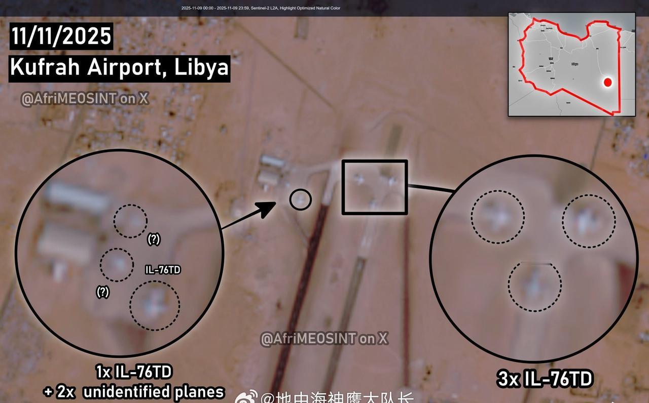 卫星图像显示,在利比亚库夫拉机场至少有四架伊尔-76TD货运飞机和两架小型运输机
