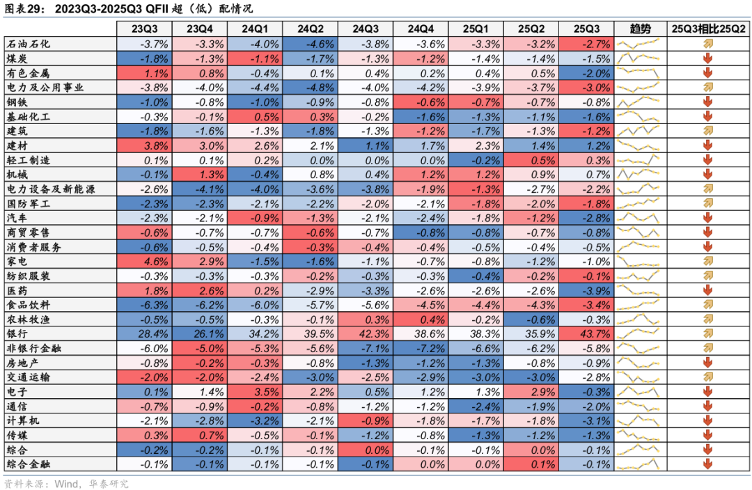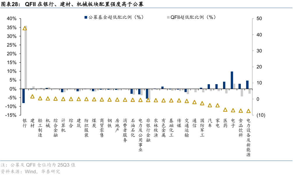持仓结构上,与公募基金相比,25Q3QFII/RQFII在银行、建材、轻工制造的配置强度相对较高,而在电力设备及新能源、食品饮料、电子等板块的配置强度相对较低。