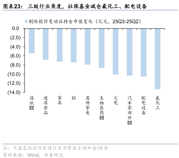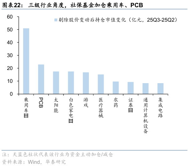 结合持股数量及超(低)配比例,进一步剔除涨跌幅来看,一级行业中,社保基金资金25Q3或主要加仓电子、汽车、传媒、计算机等行业;三级行业中,25Q3社保基金主要加仓乘用车、PCB、太阳能、白色家电、游戏,减仓氟化工、配电设备、汽车零部件、火电等。