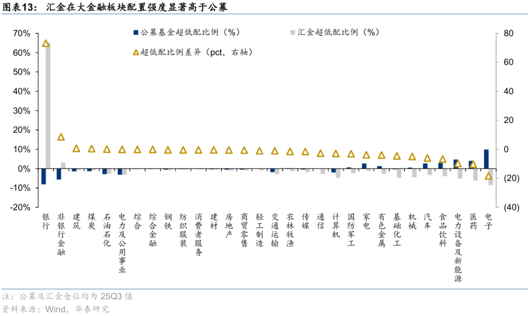 持仓结构上,与公募基金相比,25Q3汇金资金在银行、非银行金融、建筑板块的配置强度相对较高,而在电子、医药、电力设备及新能源等板块的配置强度相对较低。