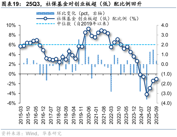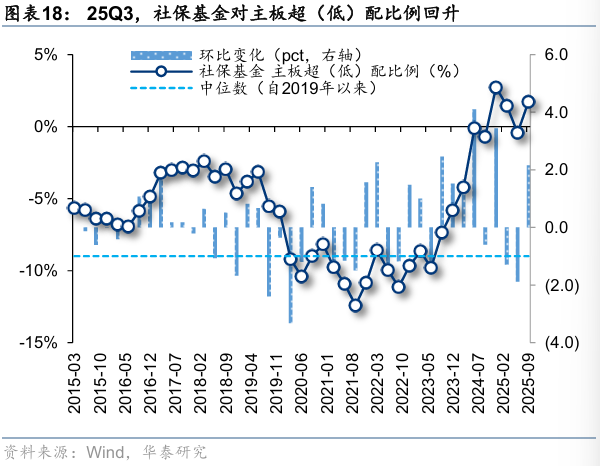 25Q3,社保基金对主板、创业板超(低)配比例回升,科创板超(低)配比例回落。25Q3,社保基金对主板、创业板、科创板的超(低)配比例分别为1.72%、-1.06%、-0.1%,环比变化2.2pct、0.4pct、-2.6pct,分别位于自2015年以来100%、0%、0%分位。