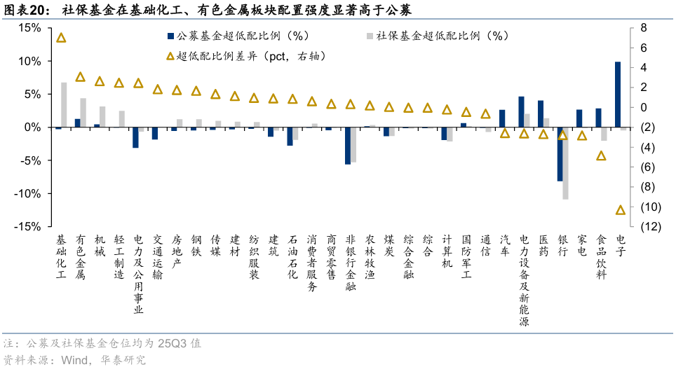 持仓结构上,与公募基金相比,25Q3社保基金在基础化工、有色金属、机械的配置强度相对较高,而在电子、食品饮料、家电等板块的配置强度相对较低。