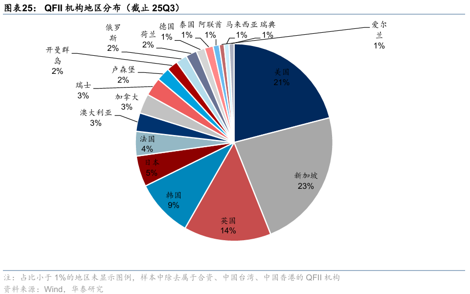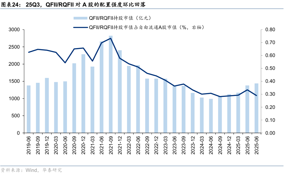 25Q3,QFII/RQFII对A股的配置强度小幅回落。2025Q3,QFII/RQFII持股市值环比小幅回升至1436亿元,QFII/RQFII持股市值占全A流通市值的比重小幅回落至25Q3的0.29%,处于自2019年以来的8%的历史低位水平。