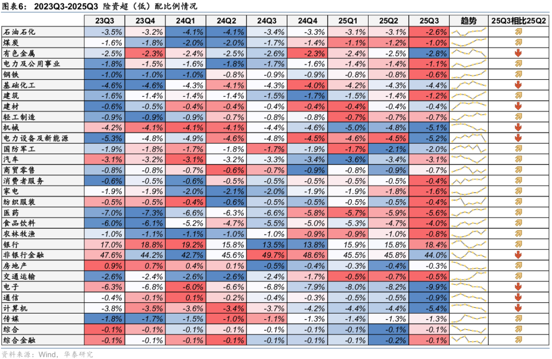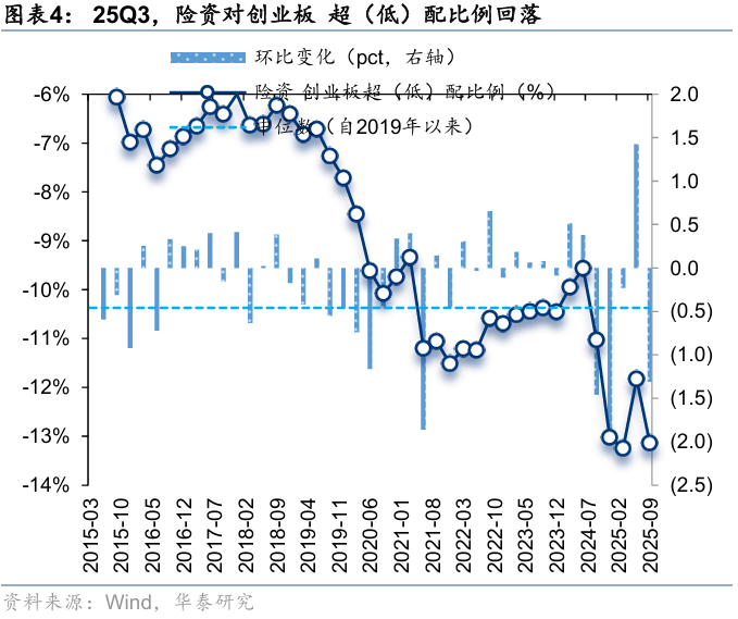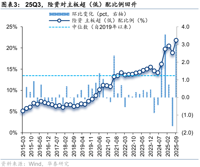 25Q3,险资对主板超(低)配比例回升,创业板、科创板超(低)配比例回落。25Q3,险资对主板、创业板、科创板的超(低)配比例分别为21.8%、-13.1%、-8.1%,环比变化+3.0pct、-1.3pct、-1.7pct,分别位于自2015年以来100.0%、2.3%、0.0%分位数。