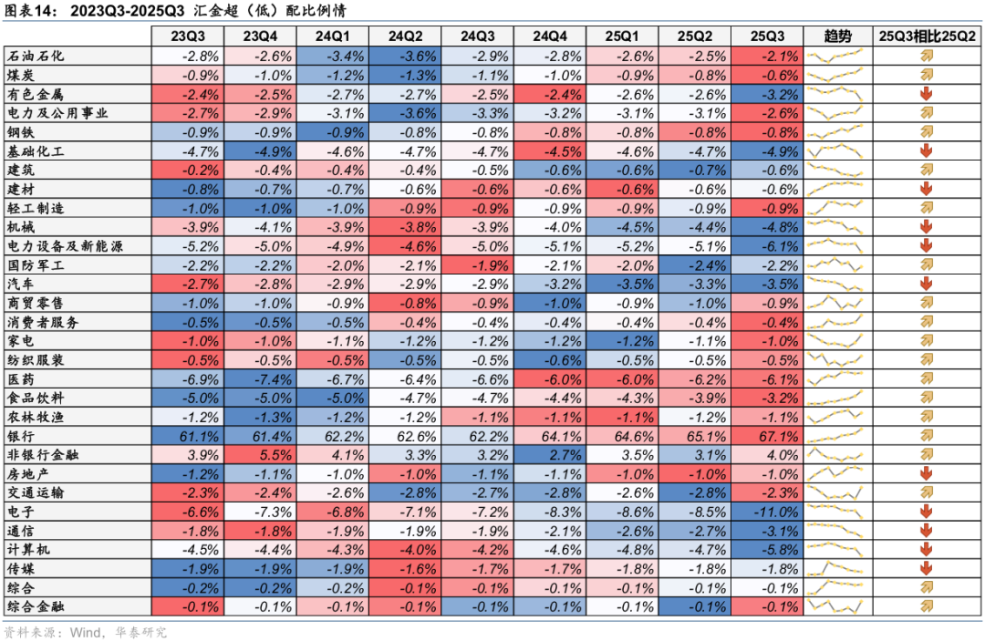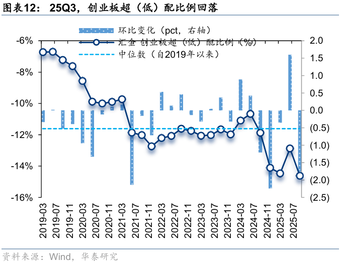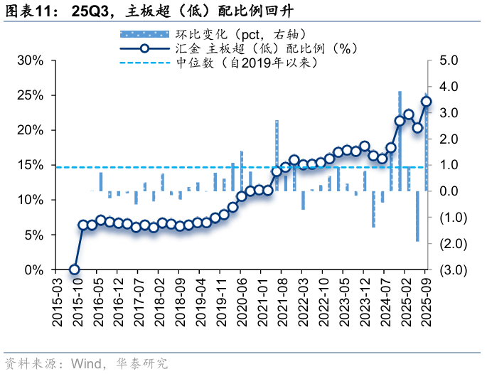 25Q3,汇金资金对主板超(低)配比例回升,对创业板、科创板超(低)配比例回落。25Q3,汇金对主板、创业板、科创板的超(低)配比例分别为24.1%、-14.6%、-8.9%,环比变化-3.76pct、-1.75pct、-2.07pct,分别位于自2015年以来100.0%、0.0%、0.0%分位数。