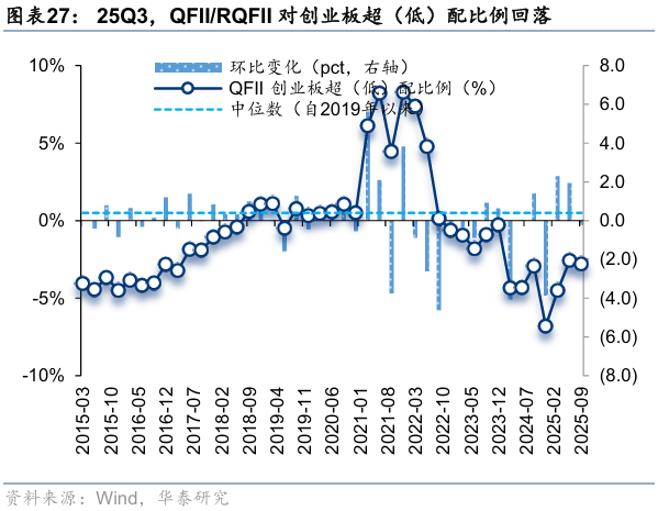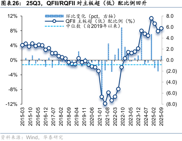 25Q3,QFII/RQFII对主板超(低)配比例回升,对科创板、创业板超(低)配比例回落。25Q3,QFII/RQFII对主板、创业板、科创板的超(低)配比例分别为8.64%、-2.79%、-5.29%,环比变化0.75pct、-0.22pct、-0.59pct,分别位于自2015年以来92.6%、34.1%、4.3%分位数。