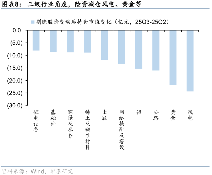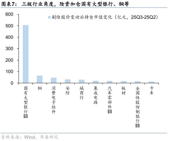 整体来看,险资加仓仍呈现“哑铃型”配置,但两侧结构有所调整。结合持股数量及超(低)比例,进一步剔除涨跌幅来看,一级行业中,险资在25Q3或主要加仓银行、综合金融、电子、汽车等方向,减仓通信、交通运输、传媒等;三级行业中,25Q3险资主要加仓国有大型银行、铜、消费电子组件、安防、城商行等,主要减仓风电、黄金、公路、铝、网络接配及塔设等方向。