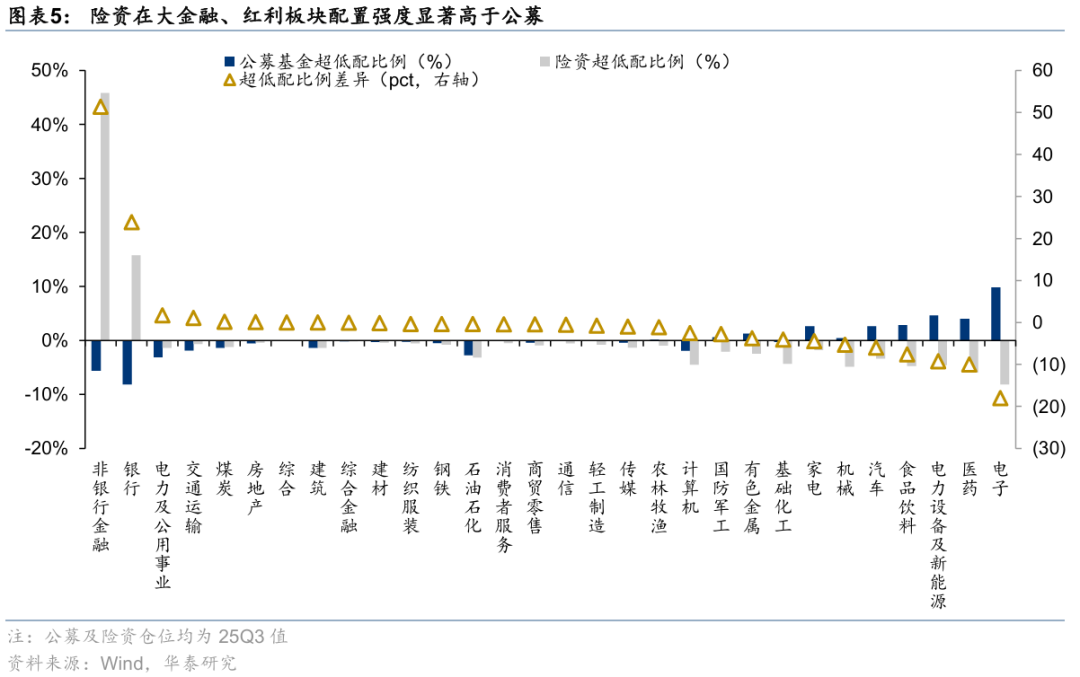 持仓结构上,与公募基金相比,25Q3险资在大金融、红利资产的配置强度相对较高,而在电子、医药、电力设备与新能源、食品饮料方面的配置强度相对较低。