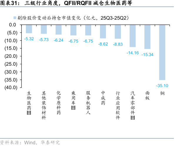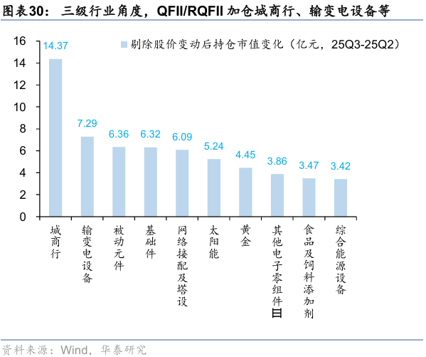 行业分布上,25Q3QFII/RQFII资金加仓电力设备新能源、银行等,减仓有色金属、医药、汽车、电子等。三级行业看,25Q3QFII/RQFII加仓城商行、输变电设备、被动元件、基础件等,减仓铜、面板、汽车零部件、行业应用软件等。