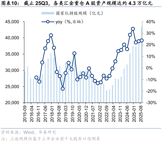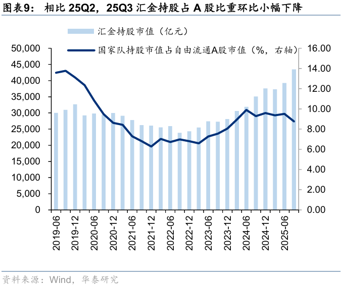规模:25Q3,汇金持股市值占全A自由流通市值的比重回落至8.8%;