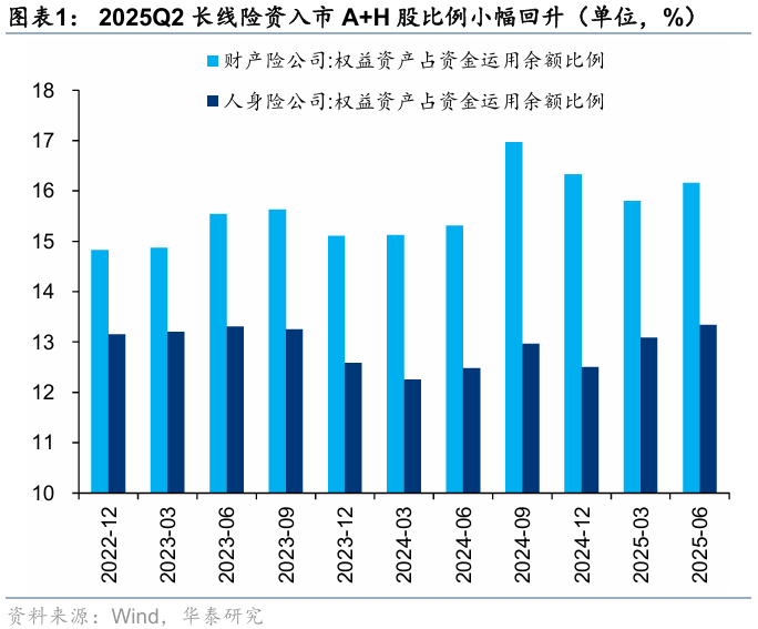 25Q2,险资对A股的配置强度环比回升。2025Q2,财产险公司中权益资产占资金运用比例为16.16%,环比25Q115.80%小幅回升,人身险公司中权益资产占资金运用比例为13.34%,较25Q113.34%小幅回升。25Q3,根据前十大股东统计的险资持股统计,险资持股规模环比Q2小幅回升。