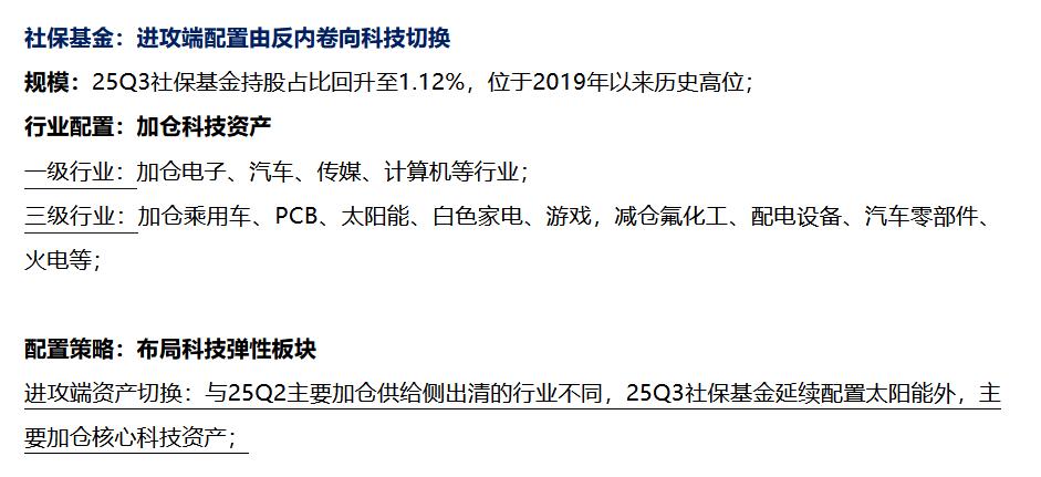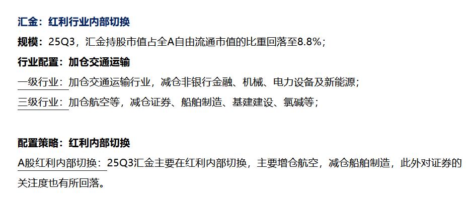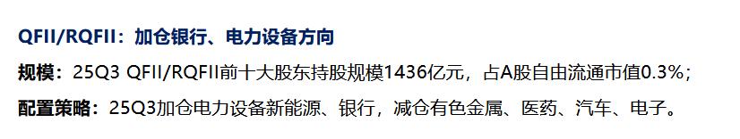 近期华泰证券发布研报,对2025年第三季度长线资金(涵盖险资、汇金、社保基金及QFII/RQFII)的持仓变化,并对其配置思路、行业增减仓情况与科技资产关注度的提升进行了系统梳理。主要机构的持仓情况整理如下: 1、险资:延续“高股息+哑铃型”策略,防御端加仓银行等红利资产,进攻端转向消费电子 25Q3险资持股规模环比回升,继续以“哑铃型”配置为主,两端小幅调整:减仓通信、传媒等AI算力方向,增仓银行等防御型高股息资产及消费电子等进攻型资产。 2、汇金:在红利板块内部进行切换,增仓交通运输、航空,减仓非银行金融与新能源 汇金持股市值占A股自由流通市值降至8.8%,但仍保持高股息偏好。其动作体现为“红利内部调仓”——增仓航空、交通运输,同时减仓证券、船舶制造及基建相关资产。 3、社保基金:进攻端由“反内卷”行业转向科技弹性板块,加仓电子、汽车、传媒、计算机 社保基金25Q3持股占比升至1.12%,创2019年以来新高。其配置重点从此前的供给侧出清行业,切换到AI及半导体等科技弹性更大的领域,同时减仓氟化工、配电设备等高供给端压力行业。