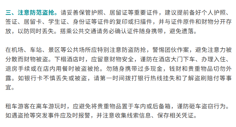 请妥善保管护照、居留证等重要证件,建议提前备好个人护照、签证、居留卡、学生证、身份证等证件的复印或扫描件,并与证件原件和财物分开存放,以防同时丢失。搭乘公共交通请务必确认证件随身携带,避免遗落。