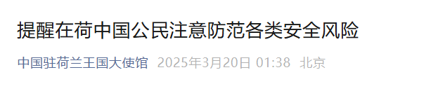记者查询发现,今年3月,中国驻荷兰王国大使馆官方账号曾发文“提醒在荷中国公民注意防范各类安全风险”。