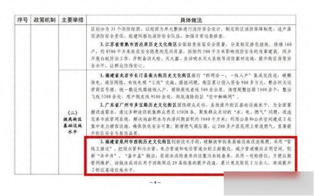 在提升人居环境方面,泉州市西街历史文化街区创新技术手段,破解狭窄街巷基础设施改造难题——采用“管线立排法”,把雨水管和污水管、电力管道和电信管道分别立排敷设,减少管道横向占用空间;创新“井中井”“盖中盖”做法,在雨水沟检查井内设置污水检查井,共用一处检修位,方便后期管网维护。该做法成功应用于西街周边29条街巷的提升改造,累计惠及居民2万余人,有效提升了街区基础设施水平。