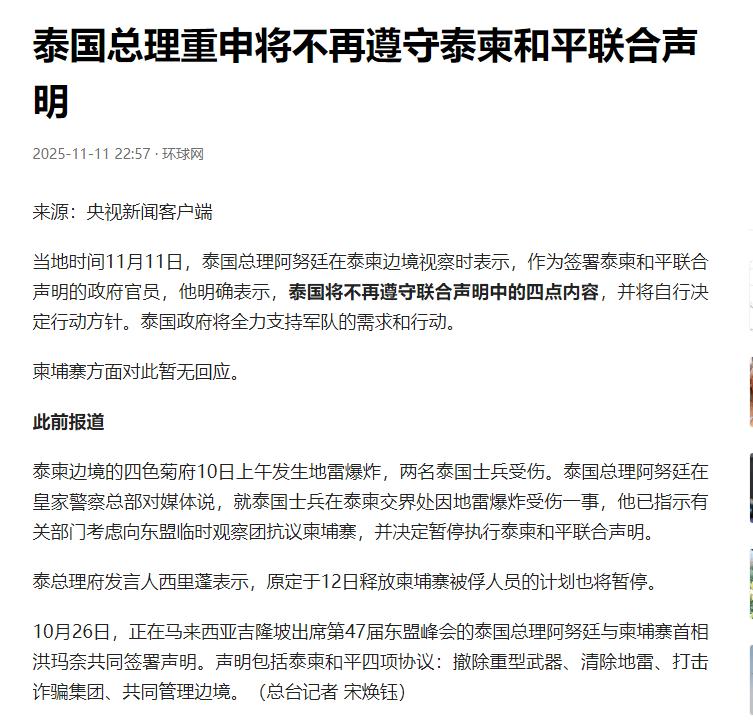 泰国反悔了   11月11日,泰国总理阿努廷表示,泰国将不再遵守泰柬和平联合声明中的四点内容,将自行决定行动方针,并全力支持军队需求和行动。柬埔寨暂无回应。   11月10号上午,四色菊府那片一直吵来吵去的边境地带,两个泰国兵正按规矩巡逻呢,脚底下突然“轰隆”一声,俩人当场就倒了。一个腿被炸得全是血,另一个被冲击波震得胸口疼得钻心,连站都站不起来,队友赶紧把他俩抬上车送医院急救。   这事儿传到曼谷,泰国总理阿努廷的火气当场就窜上来了。当天下午就拍板:先找东盟临时观察团,把柬埔寨的状给告了;再把刚签没几天的泰柬和平联合声明给停了。转天11月11号,阿努廷去边境视察,干脆把话撂得明明白白,泰国以后不遵守声明里那四条了,边境上的事儿自己说了算,军队要啥资源给啥资源,全力支持他们行动。   看着是一时冲动,其实全是这颗地雷给逼的。要知道这份和平协议来得不容易,10月26号在马来西亚东盟峰会上,阿努廷和柬埔寨首相洪玛奈才刚握着手签字,协议里写得清清楚楚,核心就四条,两边都把边境的重武器撤走、一起清地雷、联手打诈骗集团、共同管那片有争议的边境区。当时俩人都笑着说要给老百姓谋和平,没成想才半个月就变卦了。   泰国这回是来真的,不光停了协议,总理府发言人直接说,本来定好12号放柬埔寨被俘人员的事儿,也先搁一边了。意思很明确:我们的人被炸伤了,你们得给个说法,不然之前说的都不算数。   可柬埔寨那边也不是软柿子,10号半夜就发声明,把“埋新雷”的指控给顶了回去,边境这些雷,大多是上世纪70年代柬埔寨内战时留下的,那地方地形复杂,边界又没彻底划清,才没清干净,跟他们没关系。   说起来这两国边境就没太平过,从今年5月开始,因为领土的事儿已经打了好几回,大部分边境口岸都关了,就留着人道主义通道让人过。之前东盟为了劝和,8月特意派了临时观察团去边境盯着停火,团员都是马来西亚、印尼这些东盟国家的武官,就怕两边再动手。没成想观察团的活儿还没干完,新的麻烦又冒出来了。   现在最尴尬的是东盟,泰国把观察团拉来当“裁判”,柬埔寨却死活不认账,两边各说各的理。不过还好,柬埔寨国防部后来松了口,说两国军方已经碰过面了,“目前局势稳得住”,没让矛盾再升级。说到底真打起来对谁都没好处,泰国刚从中国买了不少火箭弹,柬埔寨也得掂量掂量局势,真把脸撕破了,最先遭罪的还是边境的老百姓。   其实地雷这事儿,根子还是边境问题没彻底解决。和平协议里本来就把“清地雷”当成重点,现在反倒因为地雷把协议给炸穿了,说到底还是两国没建立起足够的信任。接下来就看东盟的态度了,之前能促成两边停火,这次要是能牵头让双方坐下来,把地雷的来源查清楚,或许还能把和平拉回正轨。要是两边都憋着劲硬刚,这刚降温的边境,恐怕又要热起来了。