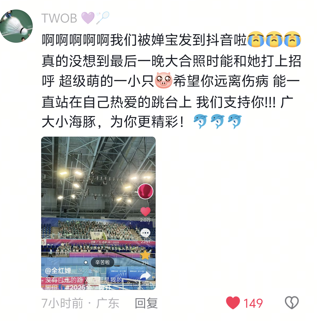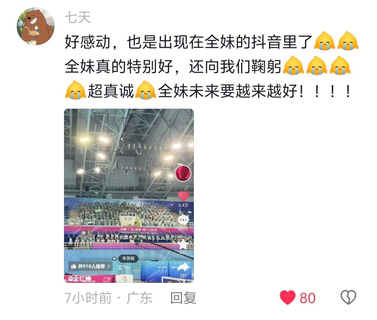 小红的全运总结贴,放了张志愿者的图,写着“辛苦啦”。这些志愿者看到自己被红放到痘印上,很感动来着,还说在现场时,小红是跟他们鞠躬告别的。小红从小到大都这样,平视尊重每一个人。