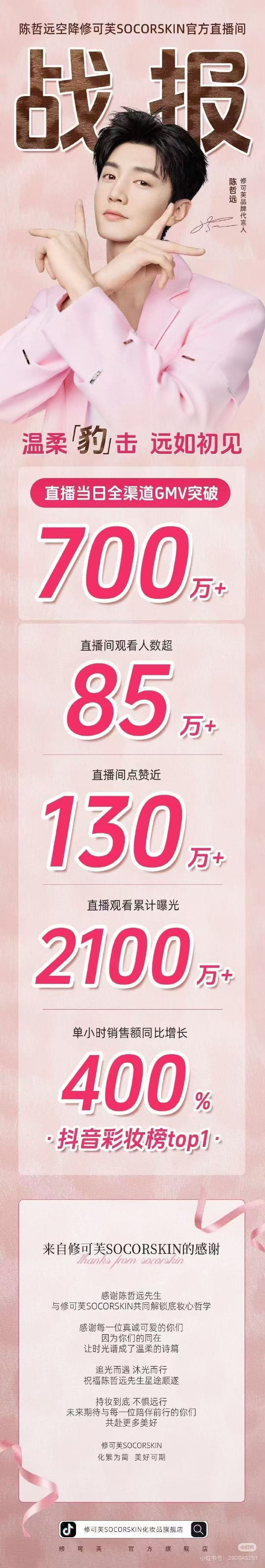 陈哲远空降修可芙直播间战报🈶空降直播间1小时全渠道GMV突破700W。号召力太