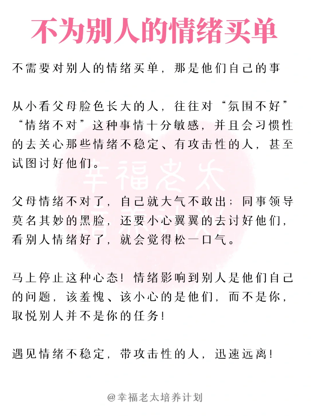你不需要对别人的情绪买单,那是他们自己的事[生气R] 🥶从小看父母脸色长大的人,往往对“氛围不好”“情绪不对”这种事情十分敏感,并且会习惯性的去关心那些情绪不稳定、有攻击性的人,甚至试图讨好他们。 😓父母情绪不对了,自己就大气不敢出;同事领导莫名其妙的黑脸,还要小心翼翼的去讨好他们,看别人情绪好了,就会觉得松一口气。 马上停止这种心态❗情绪影响到别人是他们自己的问题,该羞愧、该小心的是他们,而不是你,取悦别人并不是你的任务! 遇见情绪不稳定,带攻击性的人,迅速远离❗ 更好的自己 个人成长 自我成长 女性成长 女性力量 女性智慧 女性必看 女性觉醒 职场干货 职场日常 职场女性 职场那些事儿 健康知识科普 情绪管理 幸福老太培养计划 你会看别人脸色做事吗? [PK]