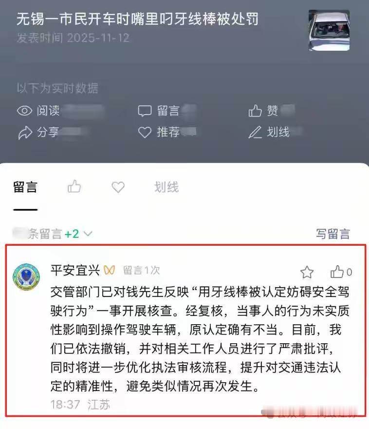 “这下尴尬了”,江苏,钱先生因为因为嘴里叼了一支牙线棒,却莫名其妙的收到了被处罚的短信,理由是会分散注意力,让钱先生哭笑不得!他说:自己全程双手都是放在方向盘上的,也没有打电话,这个理由说不过去,想让他们撤销处罚。 有记者查看了相关的规定,并没有明确说叼牙线是否不规范,该不该处罚。但咨询交通局工作人员时,他说:如果双手没有离开方向盘,我觉得没有问题。 就按照常理来讲,所有的司机难免有吃口香糖,唱歌,眨眼睛等相应的操作,这样的处罚显然不太合理,也有点说不过去。 最新消息是,钱先生的处罚已经被撤销,他们也认为原先的判定有误。但是这么明显的一个判断失误,到底是谁判的,应该给个说法,不能撤销就完了吧。。