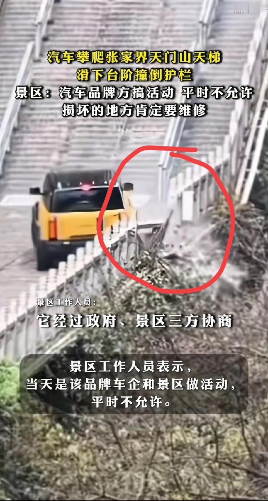 是天门山景区飘了还是某车企飘了? 11月12日,有网友拍视频称湖南张家界天门山景区,某品牌汽车尝试攀爬天梯,最终滑下台阶,撞坏护栏。 那可是天门山天梯呀,景区是干嘛的,不就是供游人游览的,景区为了钱,就可以为所欲为吗,景区虽说是由私人承包,但也只局限于运营权,里面的一草一木,一山一石还是国家的,必须严格按照国家的相关规定执行,才能确保景区的发展符合国家的法律法规和政策要求。和某车企搞这种无用功的营销,这个跟蔡国强在喜马拉雅山脉放烟花有什么区别。 再说某车企,爬个景区天梯能代表什么,为了喙头还是为了销量,老百姓买个车不就图个代步么,又不是买来天天爬天梯的,关键时刻能保命才是关键。 个人觉得不管是景区也好某车企也罢,都应该反思这种行为,景区就应该想想如何提升服务,让游客更满意这才是正事。车企就更应该造出让百姓坐起更舒适更安全的车,做个百年民族品牌,走向世界的品牌。 个人观点,不喜勿喷。