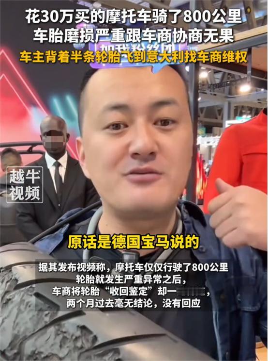 遇到狠人了!一位博主花30万在4S店购买了一辆宝马摩托车,结果只行驶了800公里,轮胎就出现了严重的磨损,找到4S店商讨没有结果,男子干脆办了签证,背着半条轮胎飞到意大利米兰摩托车展,找到宝马总部维权去了。   “既然国内没人管,那就别怕丢脸丢到国际上了!”这句话看似强硬,实则却是一位普通消费者被逼到绝境后发出的怒吼。   今年8月,一男子花了三十万买的宝马摩托车,仅仅骑了800公里,轮胎就差点报废。更让人气愤的是,4S店用“轮胎是易损件”来搪塞,拖着不给解决。   一般人可能就自认倒霉了,但这位车主不一样。他不遗余力的找消协、做鉴定。可最终,所有努力都像是无用功,好像除了自己吃下这个哑巴亏,真的别无选择了。   “吴老臭”不信邪。难道就仗着自己是“大牌”,就能为所欲为吗?难道“大牌”就自带明星光环、拥有“免死金牌”吗?   看着这辆价格堪比豪华轿车的“宝马”摩托车,“吴老臭”实在咽不下这口气。于是,他做出了一个震惊全网的举动:办签证、买机票,背着那半条磨损的轮胎,飞到米兰国际摩托车展讨要说法。   当“吴老臭”把那条惨不忍睹的轮胎放在宝马光鲜亮丽的展台上时,显得格外讽刺。轮胎是关乎生命安全的关键部件,八百公里就报废,这已经不是简单的质量问题,而是潜在的安全隐患。   更让人震惊的是,他发现同样型号的摩托车,在国外用的是米其林轮胎,而国内配的却是另一个品牌。可这个品牌的同款轮胎,早在半年前就因为“胎面胶层易脱落”被召回,而国内却毫无动静。这种区别对待让人无法接受,难道中国消费者的命就不是命吗?   这件事之所以引发如此大的共鸣,是因为它戳中了许多消费者的痛处。由于专业知识不对等、维权渠道不畅通、投诉过程漫长而痛苦,让消费者受到了天然的不公。   大多数人在权衡时间精力和维权成本后,最终选择忍气吞声。正是这种普遍的沉默,纵容某些品牌养成了傲慢的习惯。   “吴老臭”这次的跨国维权,恰恰打破了这种不对等的博弈。当所有常规途径都走不通时,他没有放弃,而是选择死磕到底。最终,中国宝马不仅为他更换了轮胎,还报销了相关费用。这样的结果也让网友们大呼过瘾。   通过这件事我们也应该意识到:只有当消费者开始较真儿时,品牌才可能认真。当一个人站出来坚决维权时,他不仅仅是在维护自己的权益,更是在为所有消费者争取应有的尊重。   对此你有什么看法?欢迎在评论区留言讨论。中国宝马 轮胎消费者维权   信息来源: 燕赵都市报2025-11-5|【车主背轮胎飞赴意大利找宝马维权】 文|墨海 编辑|史叔