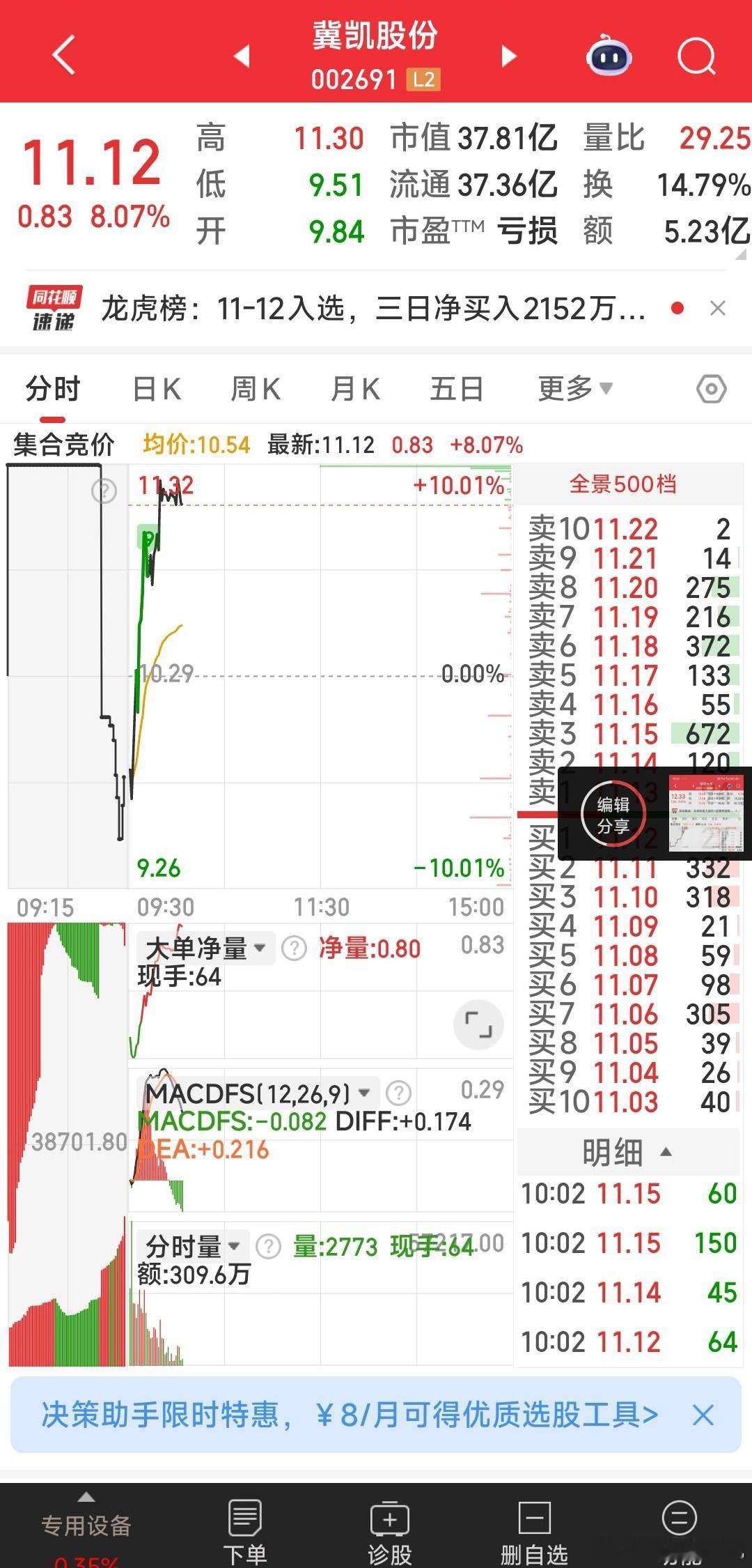 【撤单一牛,再入二牛】人民同泰不给上车机会,故撤单。资金追涨介入主力资金正在扫货的佛塑科技,冀凯股份。