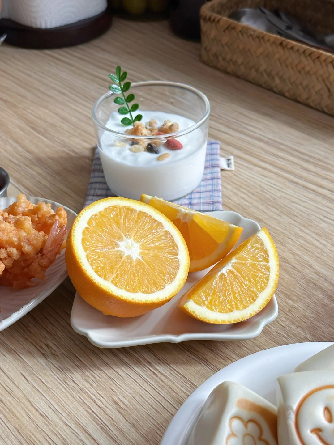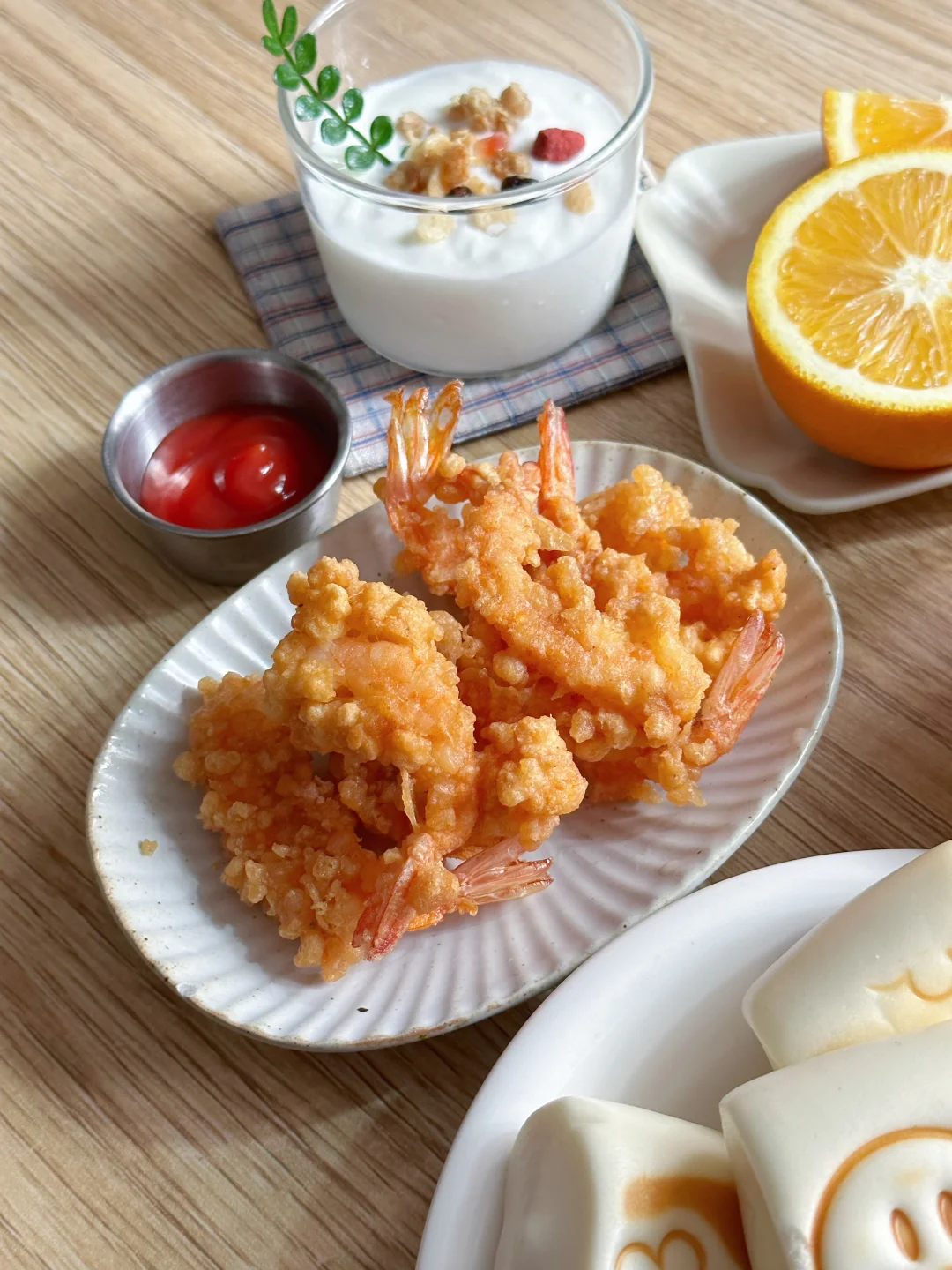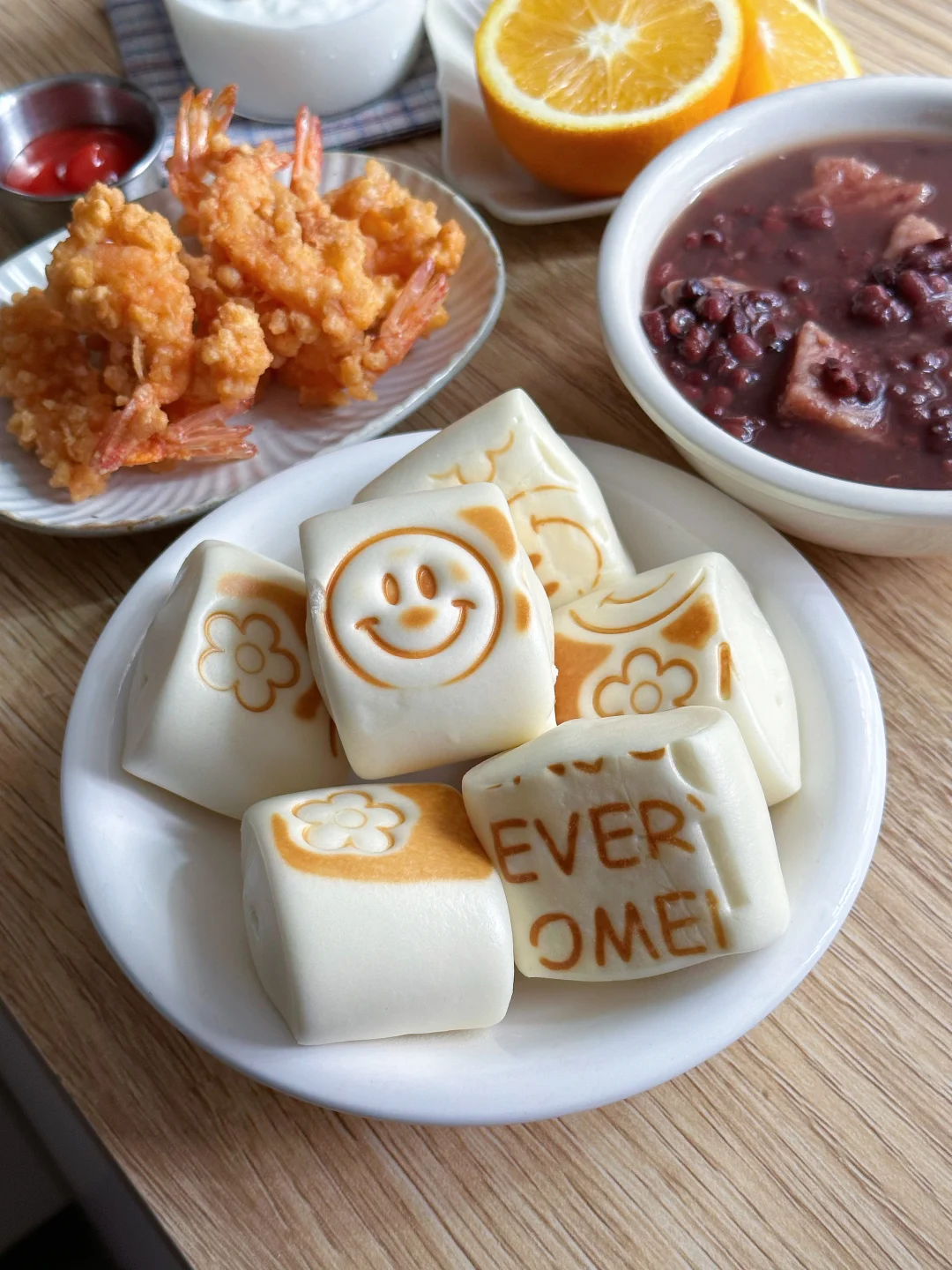 今天也是漂亮的早餐,元气够够的~ 🌼压花小馒头 牛奶小馒蒸一下,用早餐压花模具压了一下,一个个小馒头看上去就可可爱爱的,特别的治愈! 今天的光线照在馒头上,照片出来太像ai了,但确实不是,是我的漂亮早餐呀! 🫘香芋红豆粥 香甜的红豆和绵软的香芋,暖呼呼的,很适合秋冬的早晨 🍤炸大虾 🍊脐橙 🥛酸奶杯
