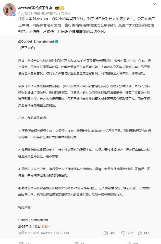 13日中午郑秀妍工作室发文回应:感谢大家对Jessica一直以来的喜爱及关注,对于近日针对艺人的恶意攻击,公司在此严正声明,网络并非法外之地,言行需恪守法律底线与公序良俗。恳请广大网友保持理性判断,不信谣、不传谣,共同维护健康清朗的网络空间。