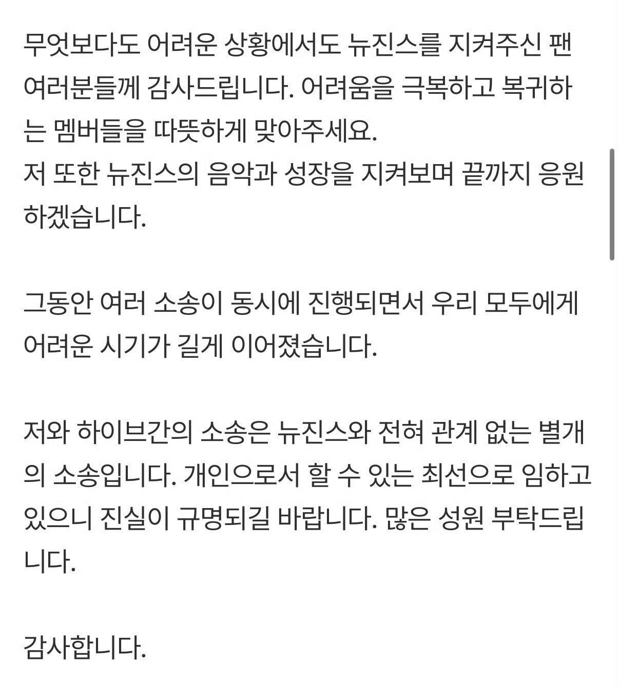 闵熙珍回应说尊重NewJeans回归 "我在任何地方都可以重新开始""但我认为,在任何情况下,NewJeans都必须作为完整的五人团体被守护。希望未来成员们能更加团结,成为更好的NewJeans,最重要的是,希望所有五位成员都能幸福。”