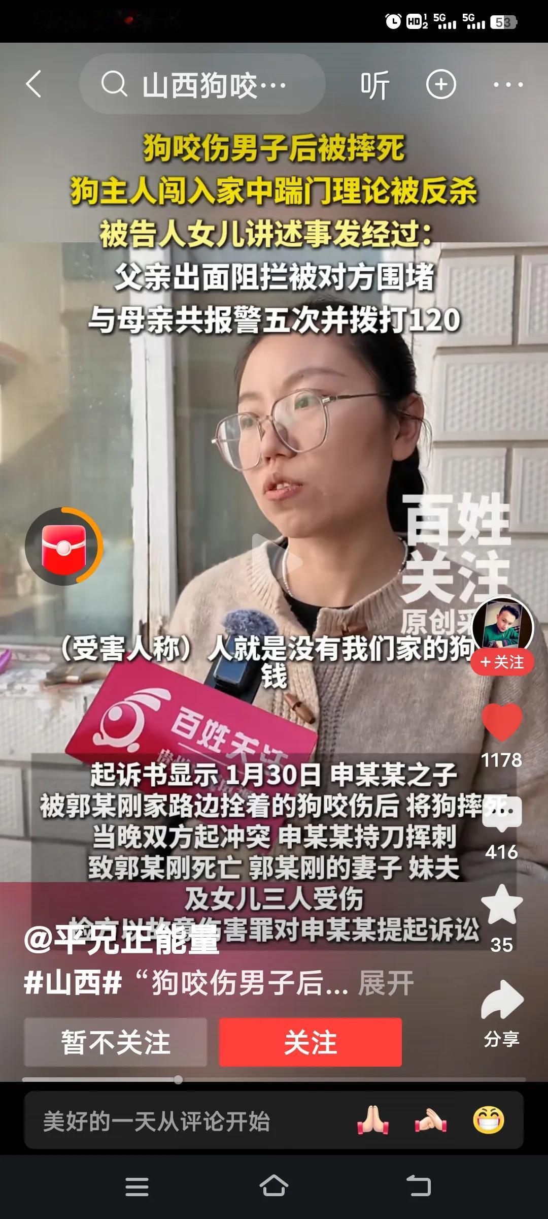 狗主人踹门上家理论反被杀案。女儿与母亲报警五次并拨打120。 起诉书显示1月30日申某某之子被路边狗咬伤之后,一气之下将狗摔死。这事情有些麻烦了,据被告人女儿小倩讲述,当晚狗主人郭某砸碎他家的玻璃进入她家院子里,“人就是没有我家狗值钱,最后一句话是我要弄死你”。父亲出面阻挡,然后就是还有其他的人将她父亲围住。而且也要打她。这期间她和母亲报了五次警。 她的讲述就这些,后面的不说也可想而知啊。可能是在争吵中发生搏斗申某刺刀将郭某刺死了,然而郭某的妹夫,及妻子,女儿都受伤了。说到底,你家的狗咬了人家,至于去那么多人到人家里闹吗?结果是伤亡全占了!在另外的新闻里看到评论区有人讲狗主人带了9个人闯入人的家中,这样的结果是咎由自取。 是个善茬决不会这样的结果了,11月13日开庭,这真让法律有些为难了感觉!