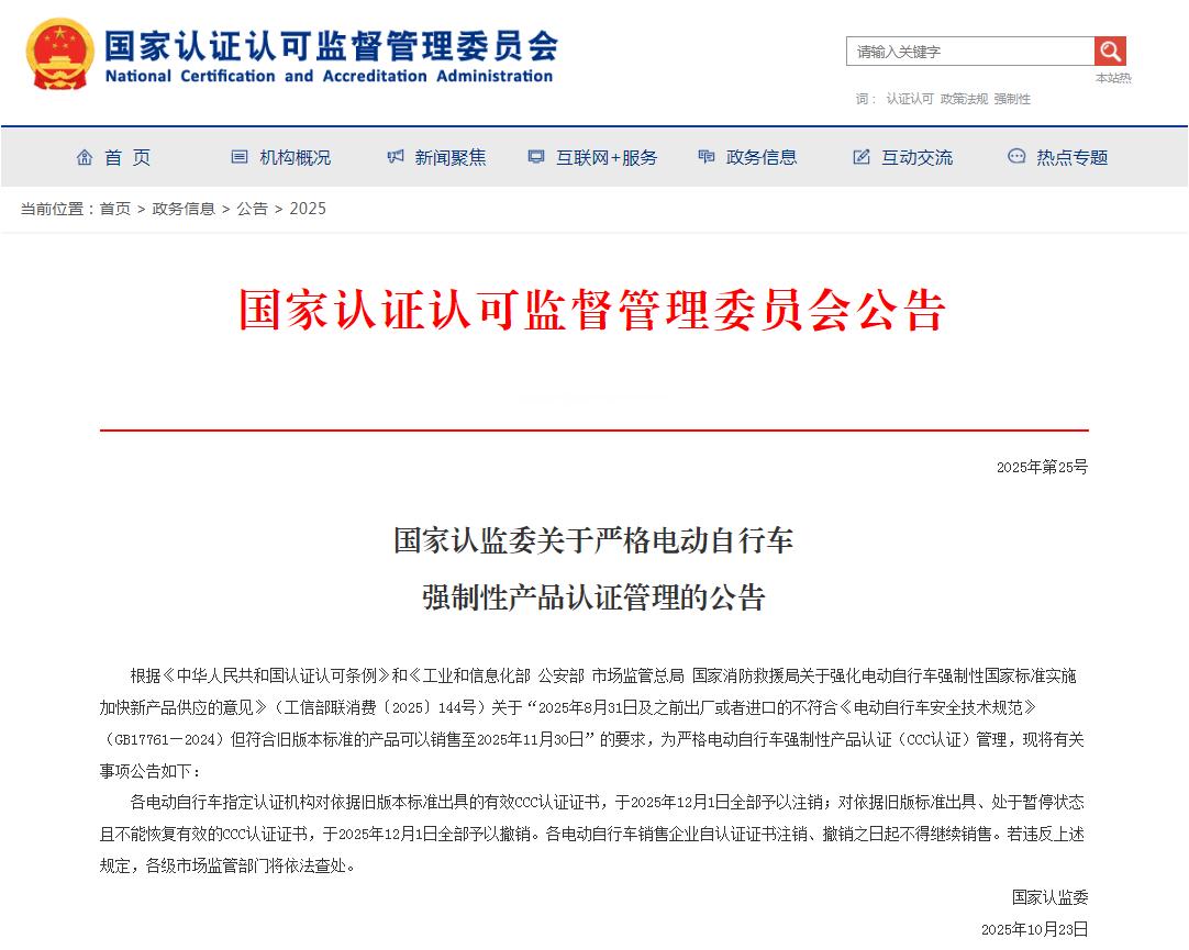 【新国标来了!】快科技11月13日消息,从江苏省消保委官微获悉,近日,国家认监委发布《关于严格电动自行车强制性产品认证管理的公告》(2025年第25号),对电动自行车生产、销售作出明确规定。公告根据《中华人民共和国认证认可条例》和《工业和信息化部公安部市场监管总局国家消防救援局关于强化电动自行车强制性国家标准实施加快新产品供应的意见》(工信部联消费〔2025〕144号)关于“2025年8月31日及之前出厂或者进口的不符合《电动自行车安全技术规范》(GB 17761—2024)但符合旧版本标准的产品可以销售至2025年11月30日”规定,对严格电动自行车强制性产品认证(CCC认证)管理提出了明确要求。公告指出,各电动自行车指定认证机构对依据旧版本标准出具的有效CCC认证证书,于2025年12月1日全部予以注销;对依据旧版标准出具、处于暂停状态且不能恢复有效的CCC认证证书,于2025年12月1日全部予以撤销。各电动自行车销售企业自认证证书注销、撤销之日起不得继续销售。若违反上述规定,各级市场监管部门将依法查处。事实上,2025年9月1日,电动自行车强制性新国标《电动自行车安全技术规范》(GB17761—2024)已经正式实施。新标准对电动自行车的防火阻燃、塑料总质量、整车质量上限、北斗定位、脚踏骑行装置等作出了规定。按要求,2025年12月1日之后,所有销售的电动自行车产品均必须符合新标准规定。消费者已经购买的不符合新标准的车辆不会被强制淘汰。消费者在选购电动自行车时,请认准CCC认证标志和产品合格证。如需核实产品合格证真伪和CCC认证证书有效性,可扫描产品合格证上的二维码,或登录全国认证认可信息公共服务平台查询。操作方式:进入平台首页点击“认证结果”,在“证书编号”栏输入CCC证书编号,点击“查询”,即可查看该认证证书状态。(快科技)