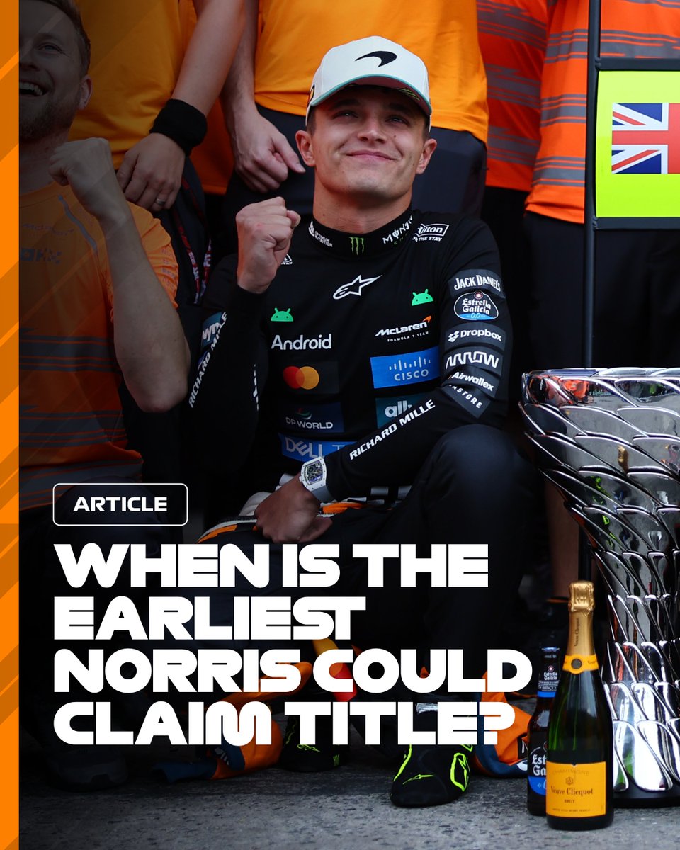 F1官方推特账号报道。兰多·诺里斯最早何时能夺得本赛季车手总冠军?在兰多墨西哥和圣保罗站连胜后,我们分析了夺冠可能性!⚔积分推算#F1
