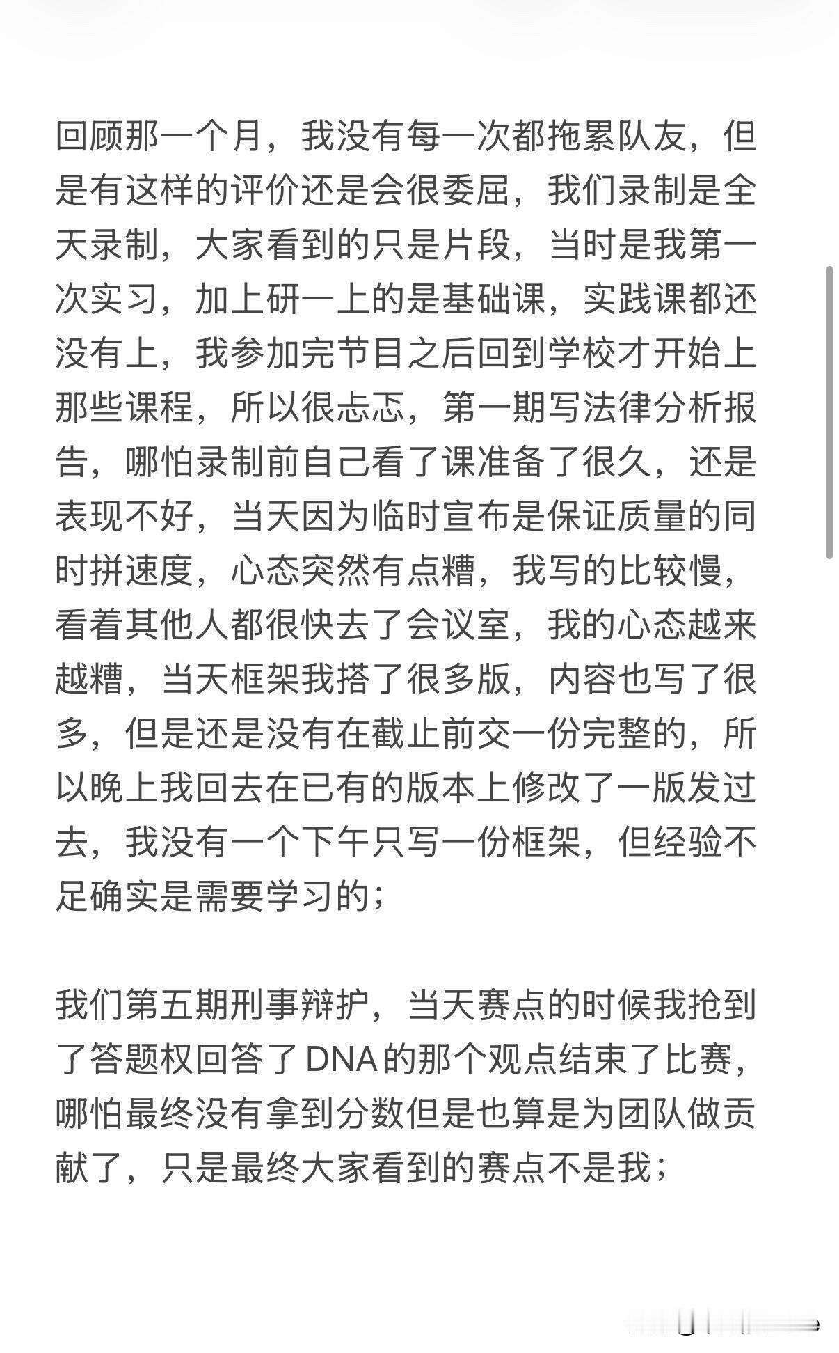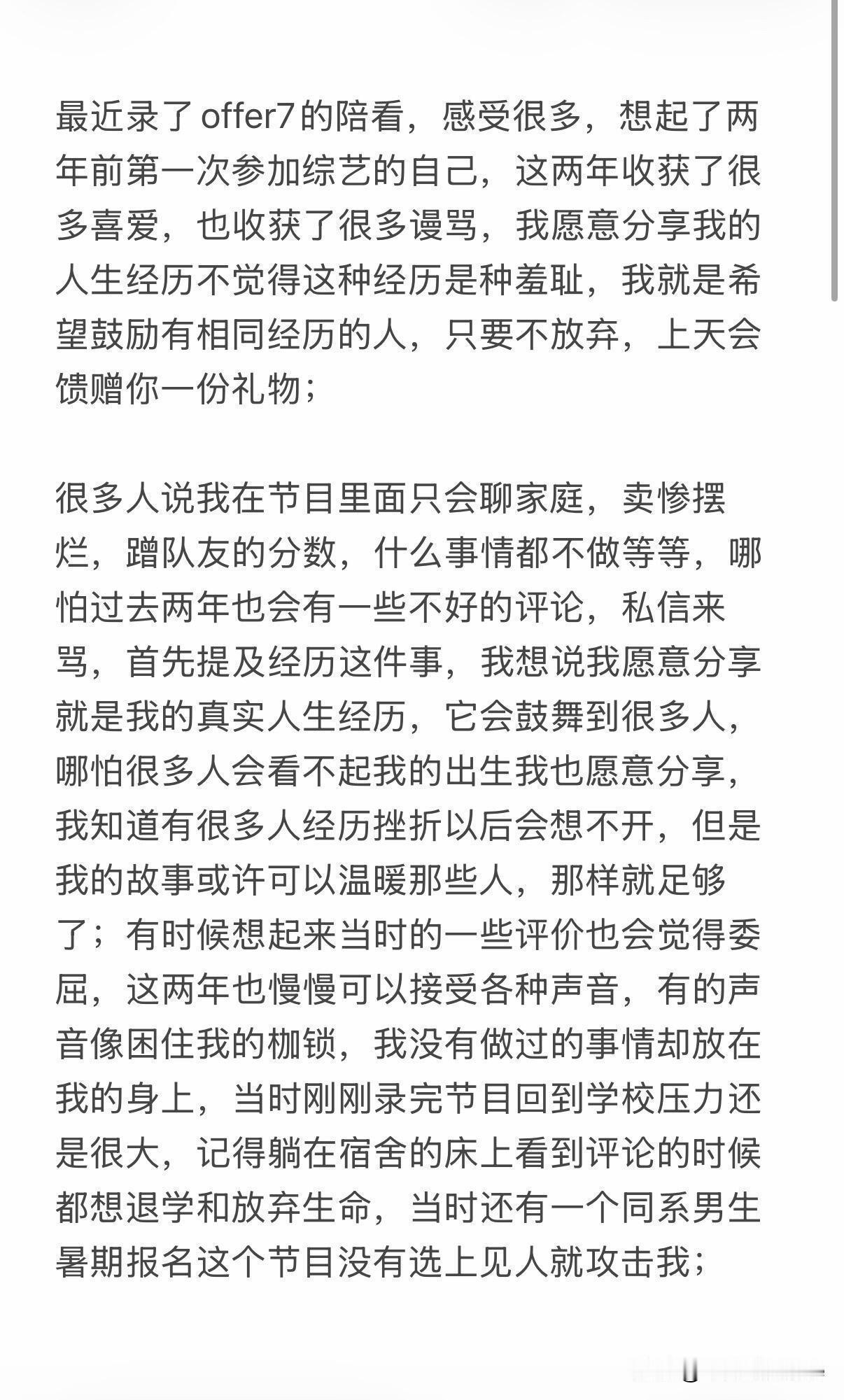 近日,黄凯时隔两年发长文回应《offer5》录制时期的一些争议,并配文“新阶段开启,想放下这两年心里的石头”。 一是黄凯说他没有一直拖累队友,只是因为节目剪辑,没有把有些内容呈现出来,他自己也是做了很多功课的,比如“法律分析报告”“刑事辩护”以及“医美案”等课题。 二是黄凯在节目中讲自己的遭遇是为了鼓励他人,而不是卖惨,反正我是有从中获取正能量。 黄凯还爆料了两件事:第一是他曾遭到同系男生攻击,因为他没有被《offer5》选上:第二是同校学姐说凯凯与她合作过,其实两人没合作过。 我是第一次知道这两件事,没想到清华大学的学生会做出这样的事情,真是不能小看人性。 汪雨橦、肖扬以及《offer7》实习生张宁宁都留言鼓励凯凯,希望凯凯能继续大步向前走,生活是自己的,坚持心中所爱。