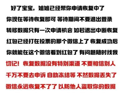 教完受害人如何注册新微信后,犯罪嫌疑人准备“隐身”,并嘱咐受害人等待30天数据转移恢复就可以了,千万不要去申诉,不要相信他人。