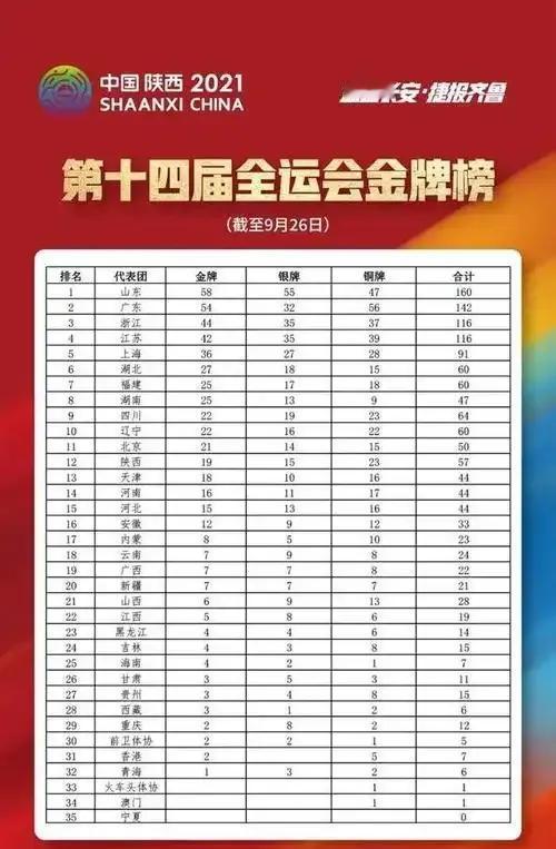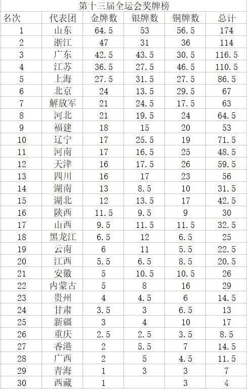 这次全运会,奖牌总数前三名花落谁家?目前,第十五届全运会正在进行中,截止到目前,奖牌前三名分别是山东62枚、广东55枚、江苏44枚;而上一届的第十四全运会,最终的奖牌总数前三名分别是山东160枚、广东142枚、浙江116枚;第十三届全运会奖牌前三名分别是山东174枚、广东116.5枚、浙江114枚。