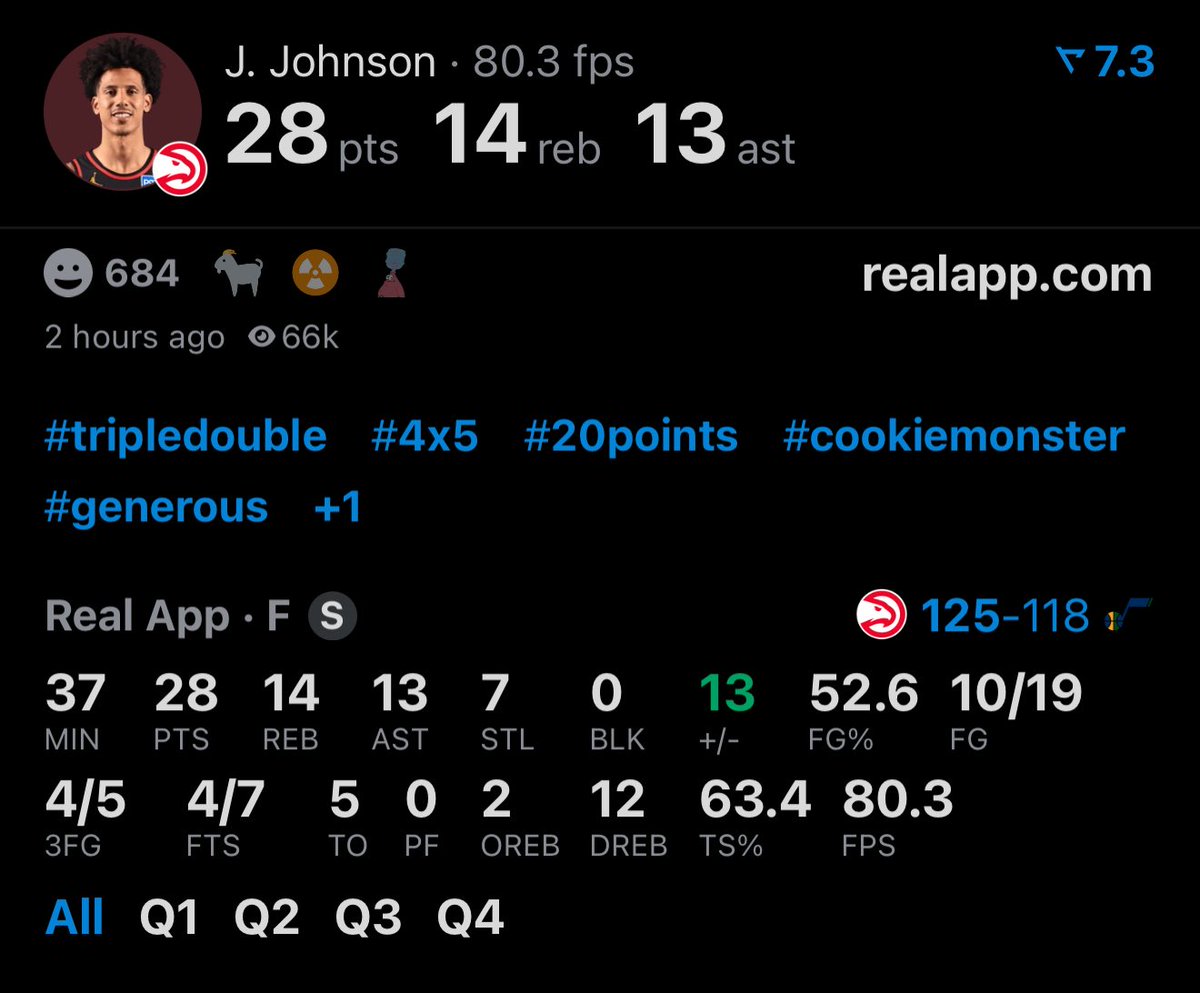 美媒LegionHoops报道,杰伦·约翰逊(JalenJohnson)的表现被严重低估:28分14篮板13助攻7抢断今晚接近四双数据。(via@realapp)