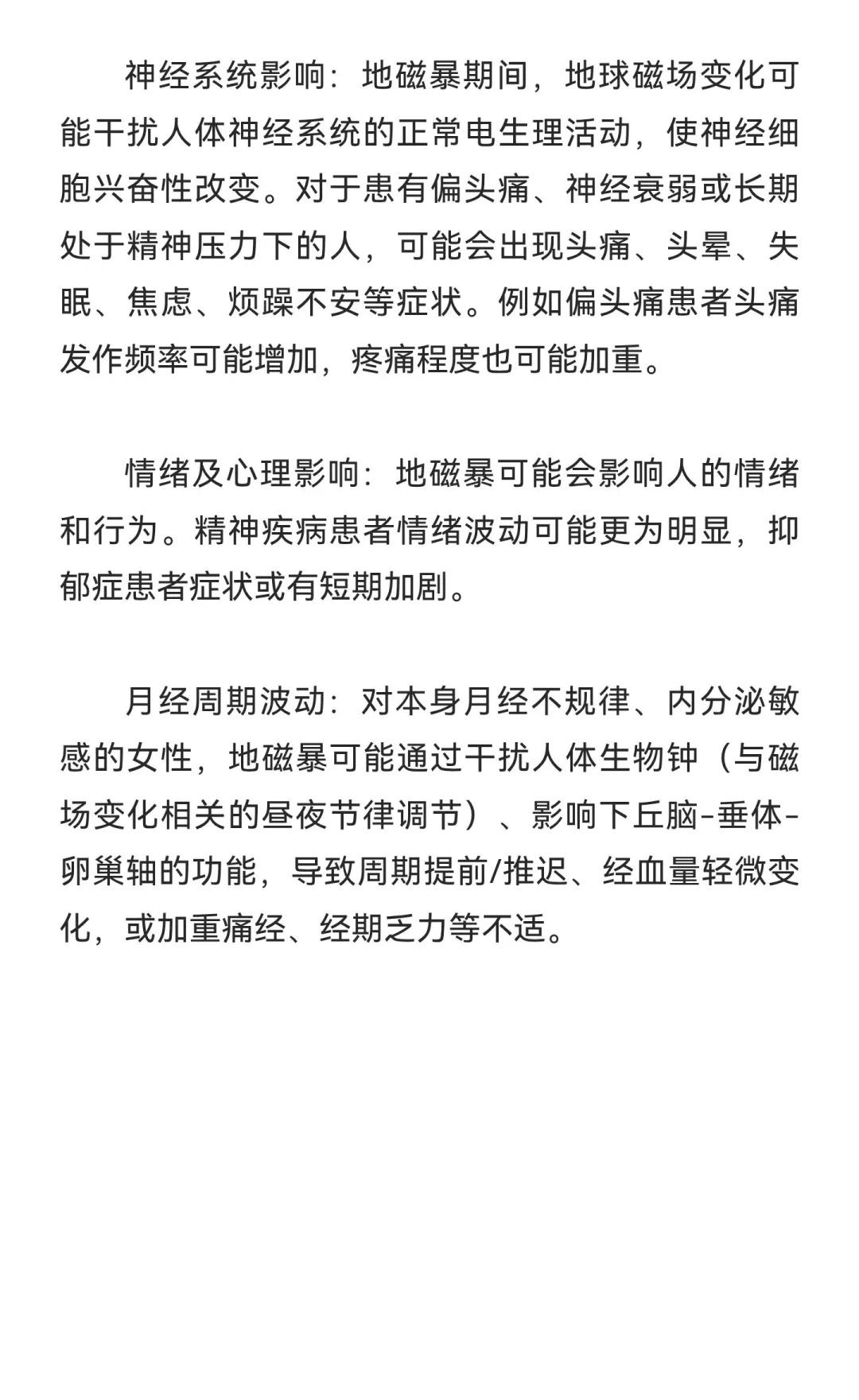地磁暴对高敏感体质的影响 地磁暴频繁爆发期间,你都中招了吗[蹲后续H] 地磁暴可能通过干扰神经系统、影响情绪和心理状态,以及通过生物钟和内分泌系统影响月经周期,导致头痛、情绪波动、月经周期变化等问题。