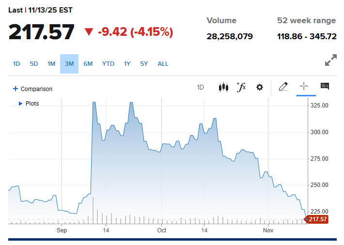 然而好景不长,此后该公司市值缩水三分之一,此前的涨幅已悉数回吐。截至11月中旬,其股价正经历自2011年以来最糟糕的单月表现。