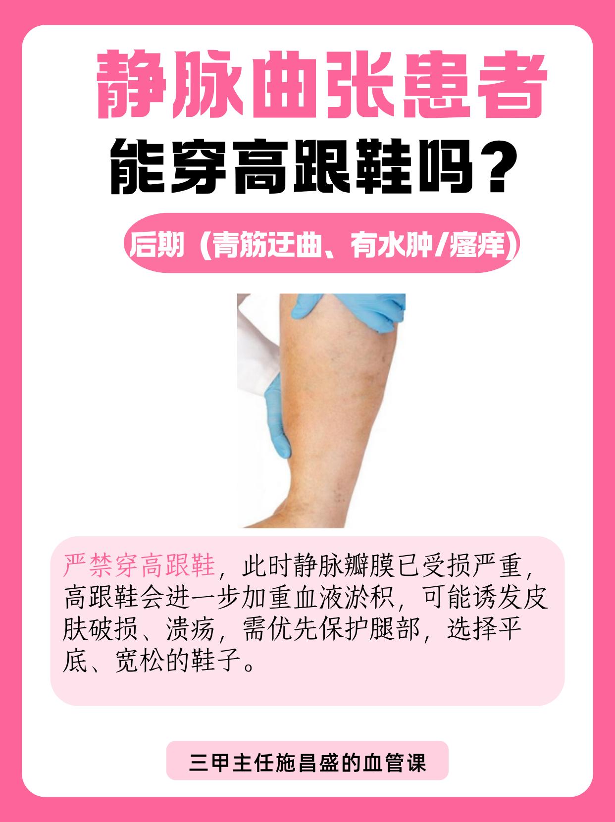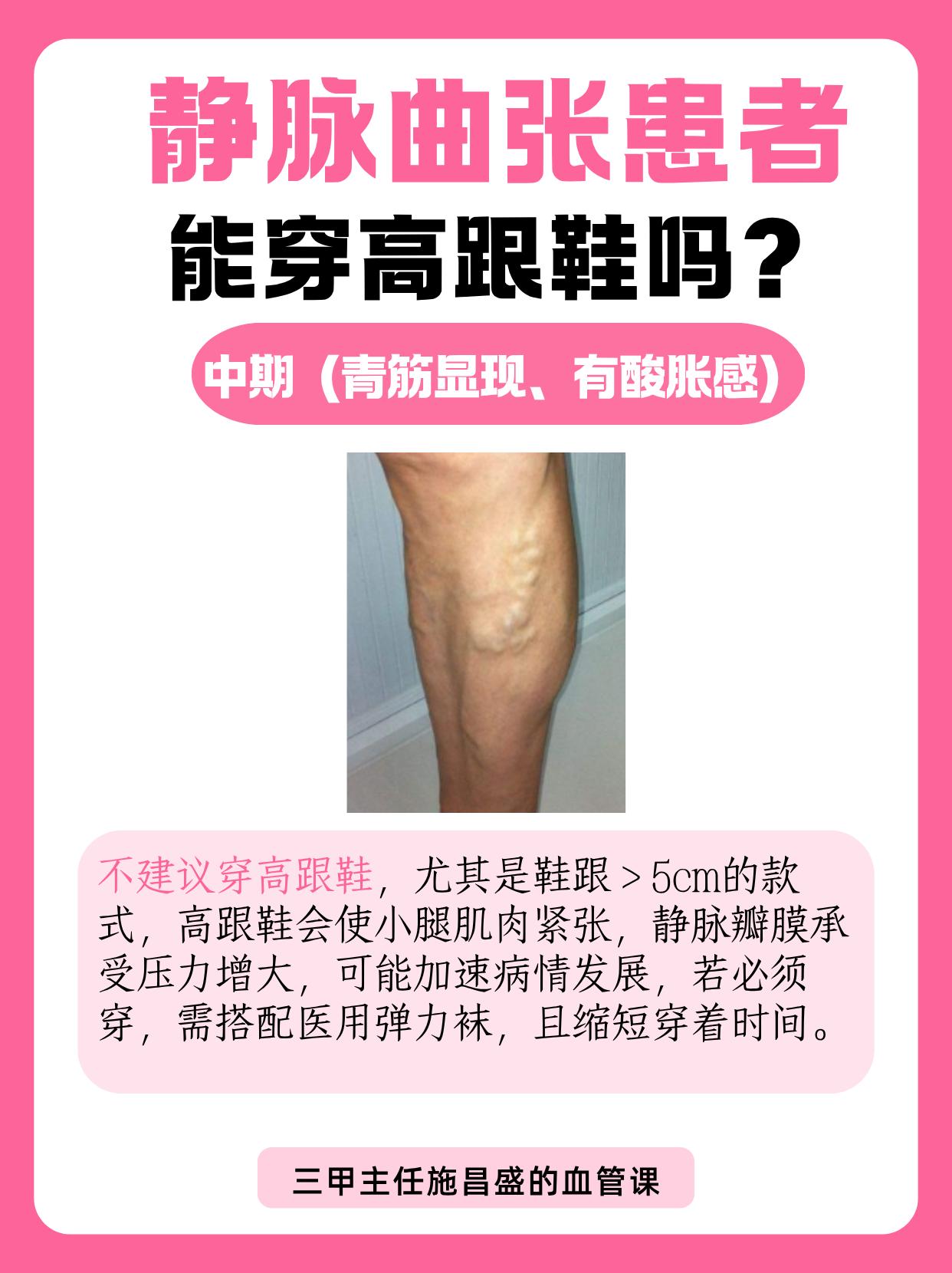 静脉曲张患者能穿高跟鞋吗?。很多女性患者关心“能否穿高跟鞋”,需根据病情阶段判断