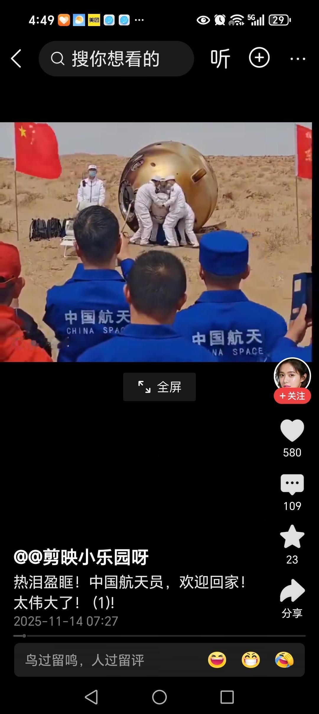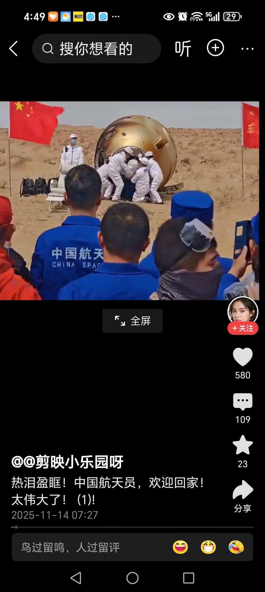 悬着的心彻底落地!神舟二十号航天员乘坐神舟二十一号回家了,航天员陈冬,陈忠瑞,王杰三个人,他们回家的飞船,不是自己上天时的那艘飞船,而是神舟二十一号飞船。 这在中国载人航天史上,可是头一回。 这个“稳准安全”的决定,让我们知道中国航天人的本领强大,让我们热泪盈眶,太激动了! 神舟20号原来是定在11月5号开始回家。 可是就在这个时候,突然发现了返回舱玻璃上出现了细微裂缝。 就是这个裂缝,让专家组评估,神舟二十号不能安全栽人返回。 这可咋办? 专家组有办法。 他们想出了一个换船的办法。 他们三个人做神舟二十一号回家,把神舟二十号留在太空。 说干就干。 三名航天员收拾收拾自己的东西,搬到了神舟二十一号飞船里面。 这就像我们开车,车坏了,又换了另一辆车开的道理是一样的。 不过,他们是在太空上。 这是中国航天员第一次,不坐原来那艘飞船回家。 三位航天员在太空待了半年,出舱四次、完成N多实验,还和神舟二十一号乘组实现“太空会师”。 现在,我们的空间站,能同时接待两个乘组,这实力真的藏不住! 现在,我们太空的空间站上,还有三位航空员,他们是张陆,武飞,张洪章。 他们仨人乘坐的神舟二十一号飞船,被陈冬,陈忠瑞,王杰三人开回了家。 很多人都会问,那这三名航天员咋回家呀? 当然是重新发射新的飞船去太空,接他们回家。 现在,我们三个飞行员着陆场安全着陆。 每一个环节都发挥极致,我们不追求“快”只追求“万无一失”。 我们航天员的生命安全最要紧,这就是中国航天人的职责。 其实,航天最动人的从不是速度,而是“把航天员安全带回家”的执念。 神舟二十号的英雄,坐着神舟二十一号的船回家了。 从神舟一号到二十一号,中国航天一步步稳扎稳打,用实力证明,我们航天人的本领强大。 中国航天给全世界上了一堂安全课。 欢迎三位英雄安全回家。 14亿人悬着的心终于落地。 向英雄航天员致敬!
