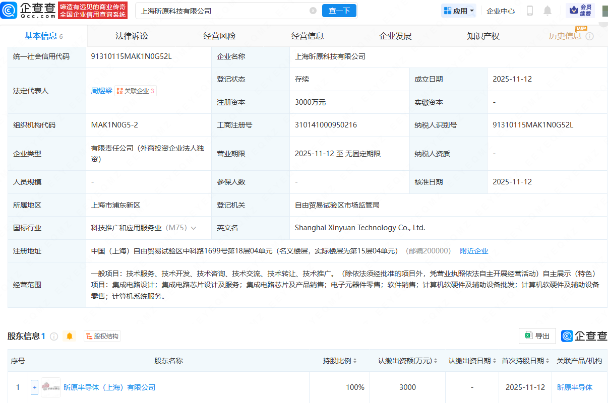 企查查APP显示,近日,上海昕原科技有限公司成立,法定代表人为周煜梁,注册资本为3000万元,经营范围包含:集成电路设计;集成电路芯片设计及服务;集成电路芯片及产品销售;电子元器件零售等。企查查股权穿透显示,该公司由昕原半导体(上海)有限公司全资持股。