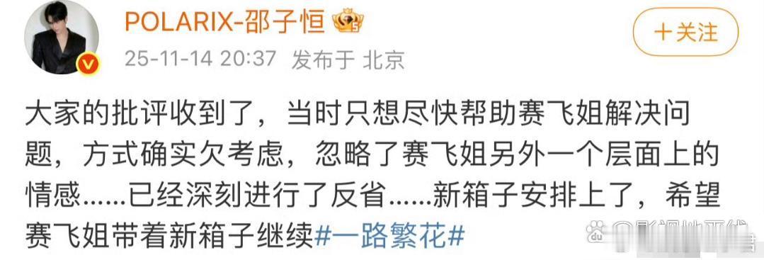 14日,《一路繁花》中邵子恒赵柯淳暴力拆箱,何赛飞落泪关镜头引热议。邵子恒、赵柯淳均发博道歉,刚刚,何赛飞也发文回应称用重力敲开是自己同意的,“是我不好不要错怪了弟弟噢”。