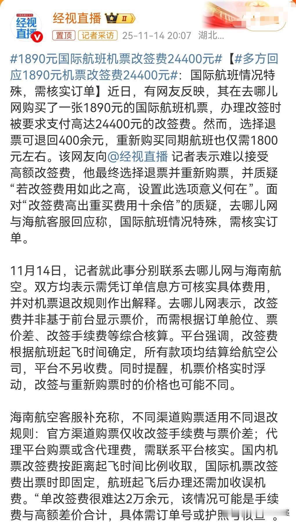 这真是离谱的妈妈给离谱开门,离谱到家了。 11月14日,我在网上看到这么个消息。 1890元国际航班机票改签费24400元,改签费这么高,那是肯定不会选择改签了。 那这样的改签设置有何意义? 真的是莫名其妙。 退票也只能退400多块,重新购买也只要1800元左右。 这种离谱的高改签费现象为什么会发生呢? 真是让人百思不得其解。 太败好感。