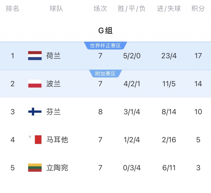 世预赛欧洲区G组积分榜
